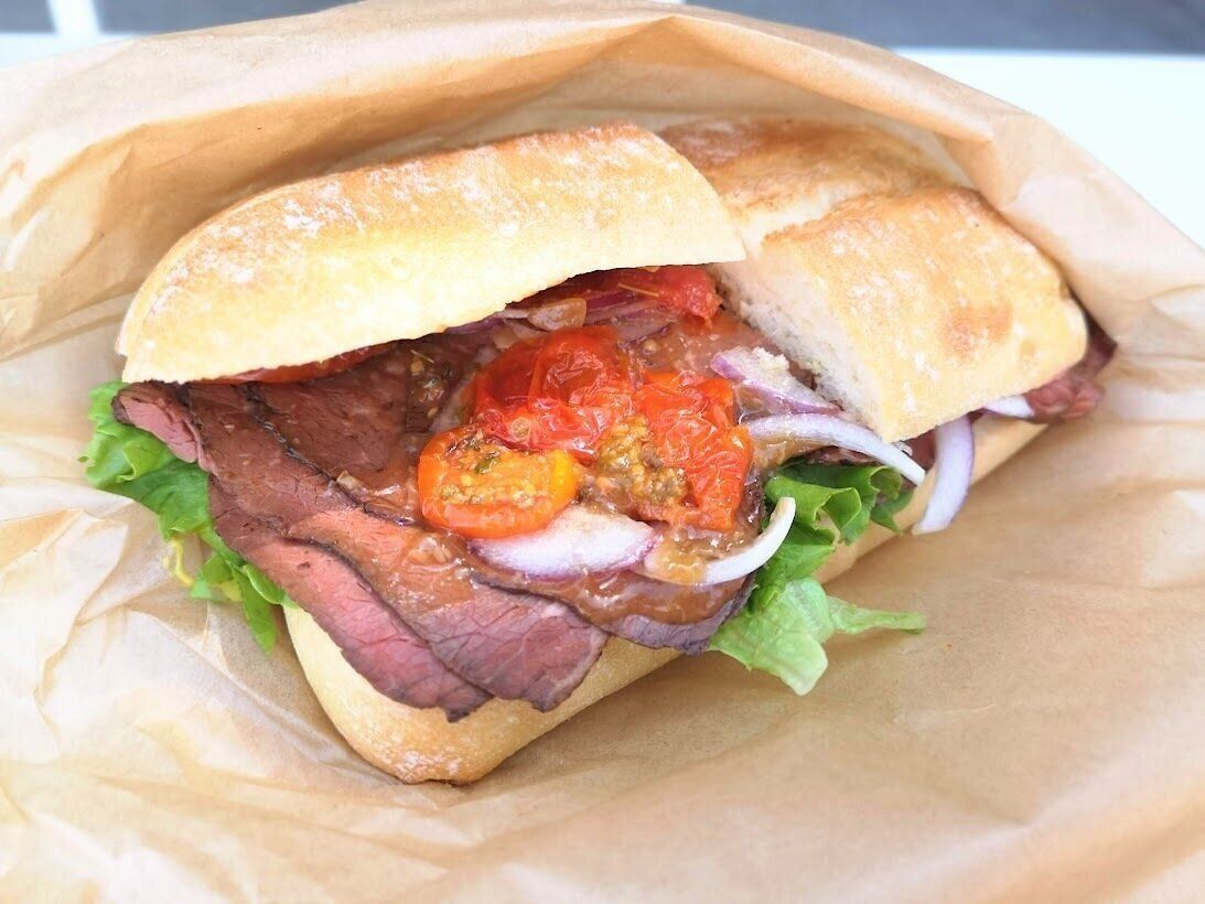 ハード系のパンにたっぷりの具材が挟まれていて、上からドライトマト、ソース、玉ねぎ、ローストビーフ(10枚)、レタス、マスタードと王道の組み合わせ!