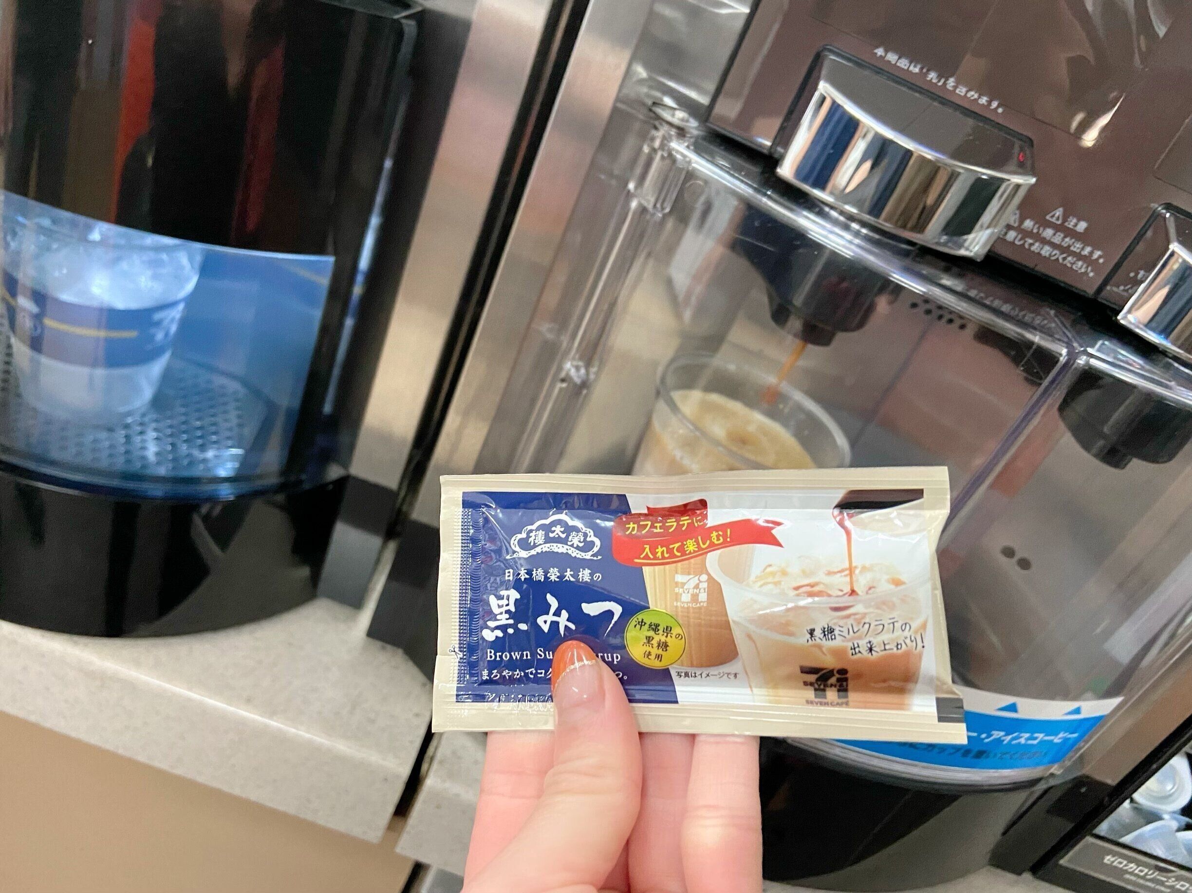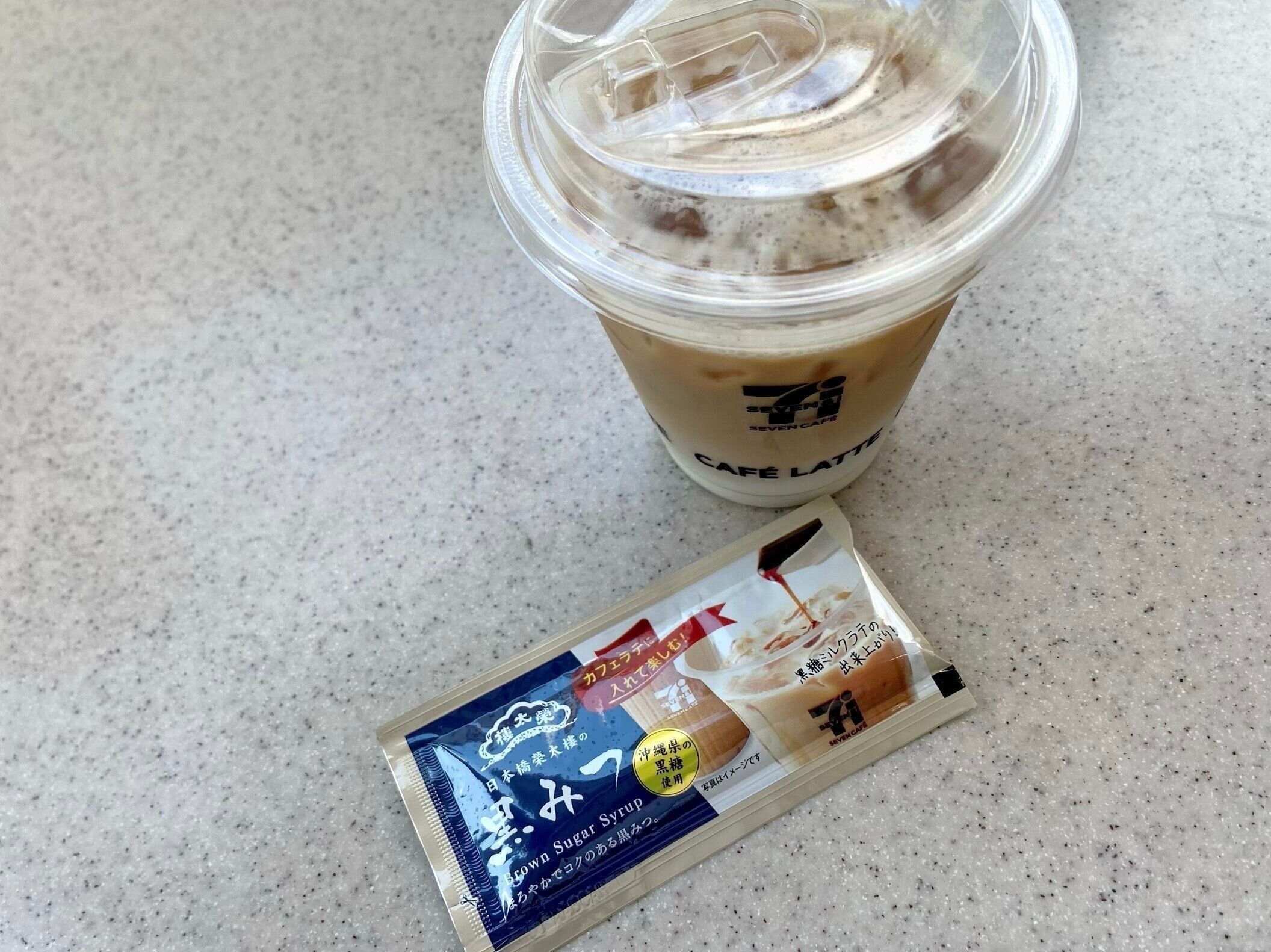 「日本橋榮太樓の黒みつ」は、東京・日本橋に本店を構える老舗和菓子店 榮太樓總本鋪が、セブンカフェのカフェラテに入れて楽しむよう作ったこだわりの商品。沖縄県の黒糖を使用し、カフェラテと合わせても、黒みつのコクと旨味をしっかりと感じられるよう開発されました。私が訪れた店舗ではレジの真横に陳列されていました!