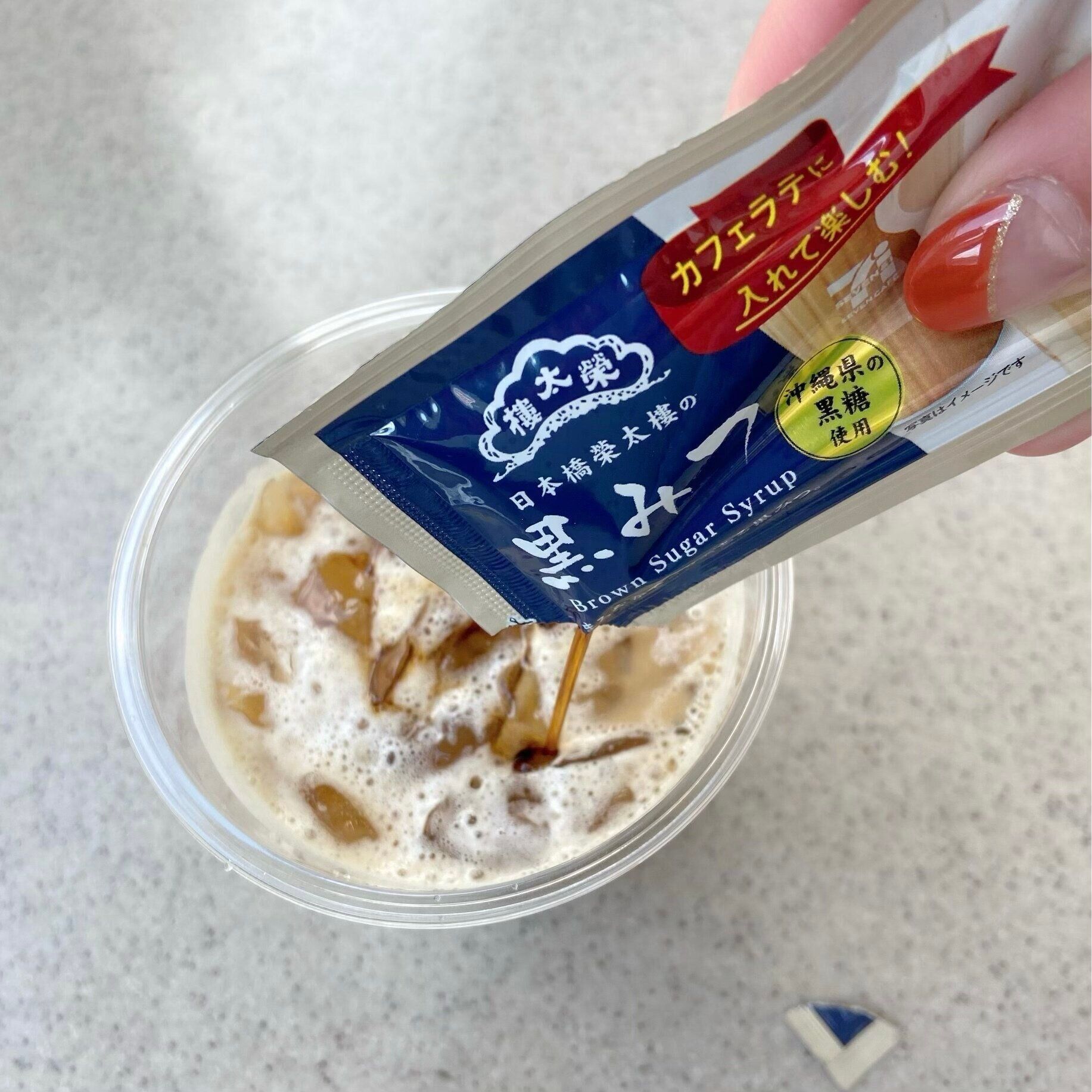 アイスカフェラテに入れていただいてみました。封を切った瞬間から黒糖のいい香りがします。黒蜜の色と香り、とろりとした質感に、カフェラテに入れながらもワクワクします。