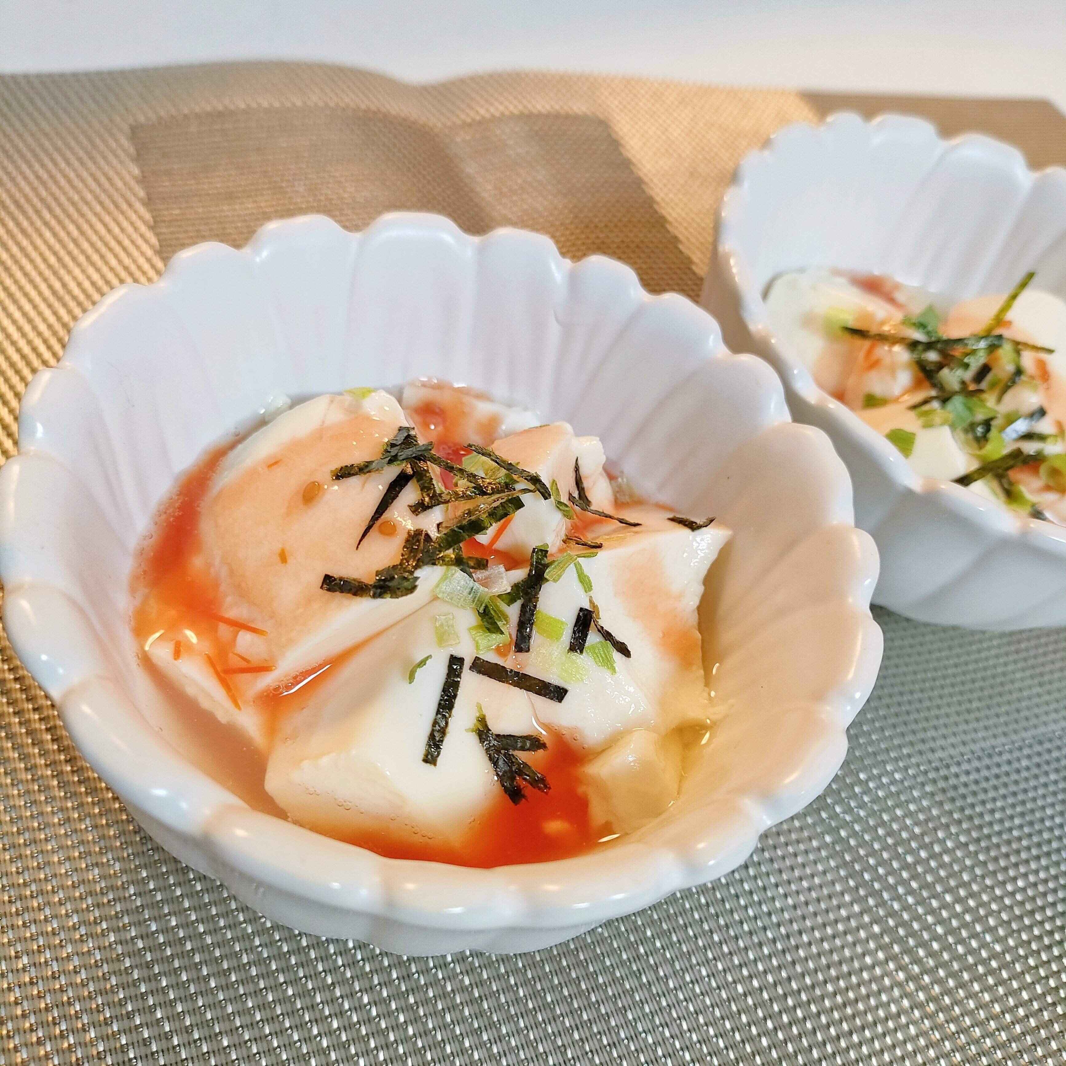 冷たい豆腐とトマトの相性は最高です!刻み海苔とネギをちらして、トマト冷ややっこが完成です。家族にも大好評でした。