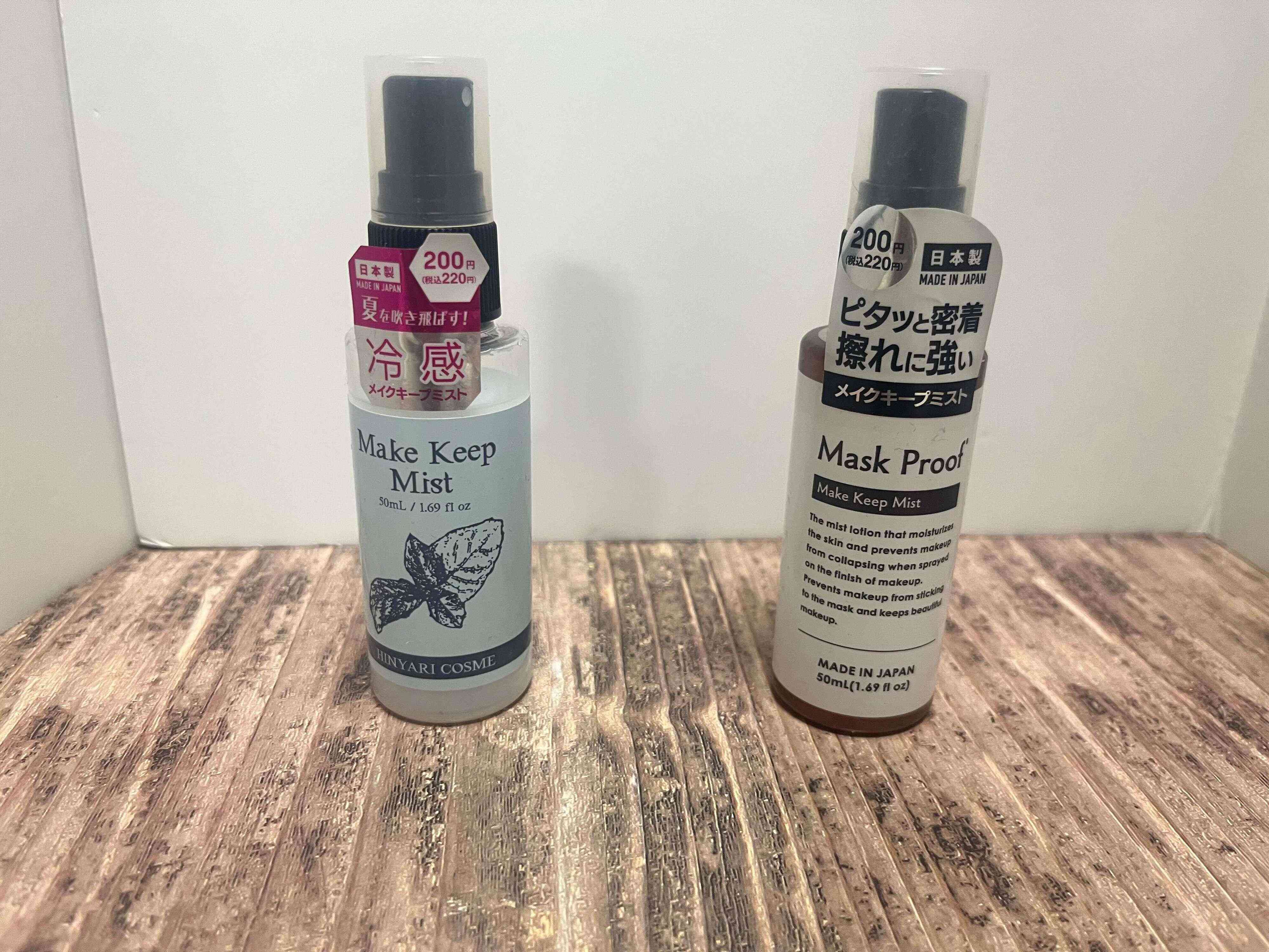 写真右が、今まで愛用していた「メイクキープミスト」。メイクの仕上げに、顔にスプレーすると崩れにくくなるという、マスク生活にありがたいミスト。220円商品ですが、安心の「日本製」で、手放せない1品となっていました。