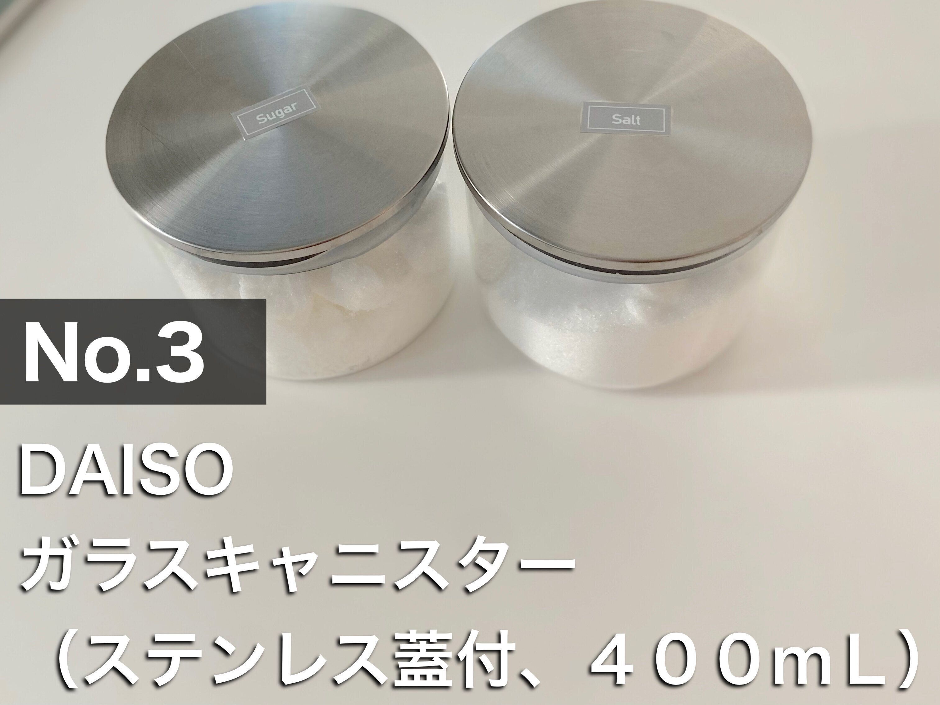 こちらはダイソーのガラスキャニスターで、ステンレスぶたのものと竹ぶたのものの2種類がありました。ふたの内側にはシリコンがあり、しっかりと封をすることができます。