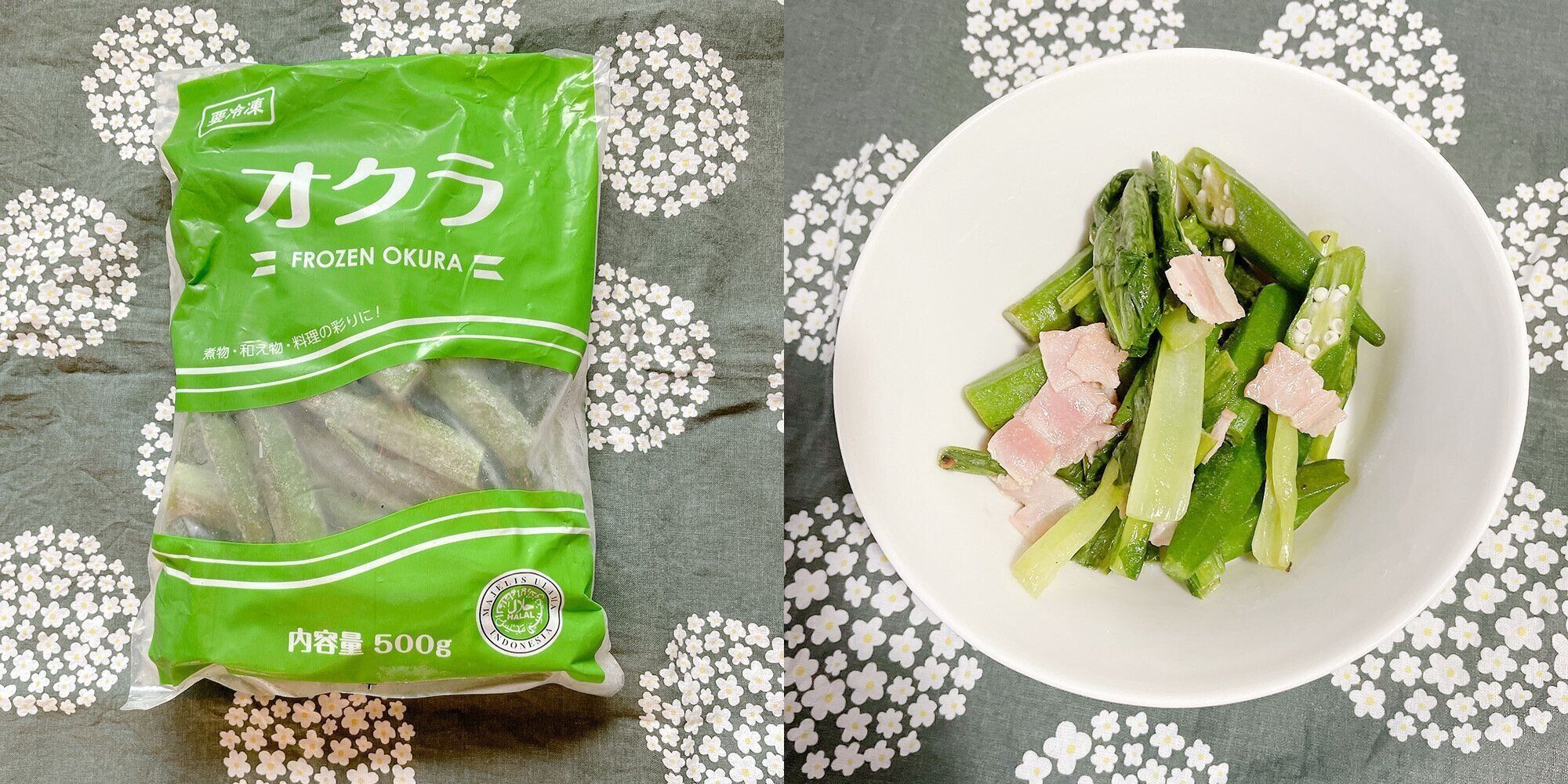 今回初めて買ってみたのは、カットしていないオクラ。大きさも十分なオクラが500gも入っています。解凍したものを半分にカットし、ベーコンと小松菜と一緒にバター醤油で炒めました。