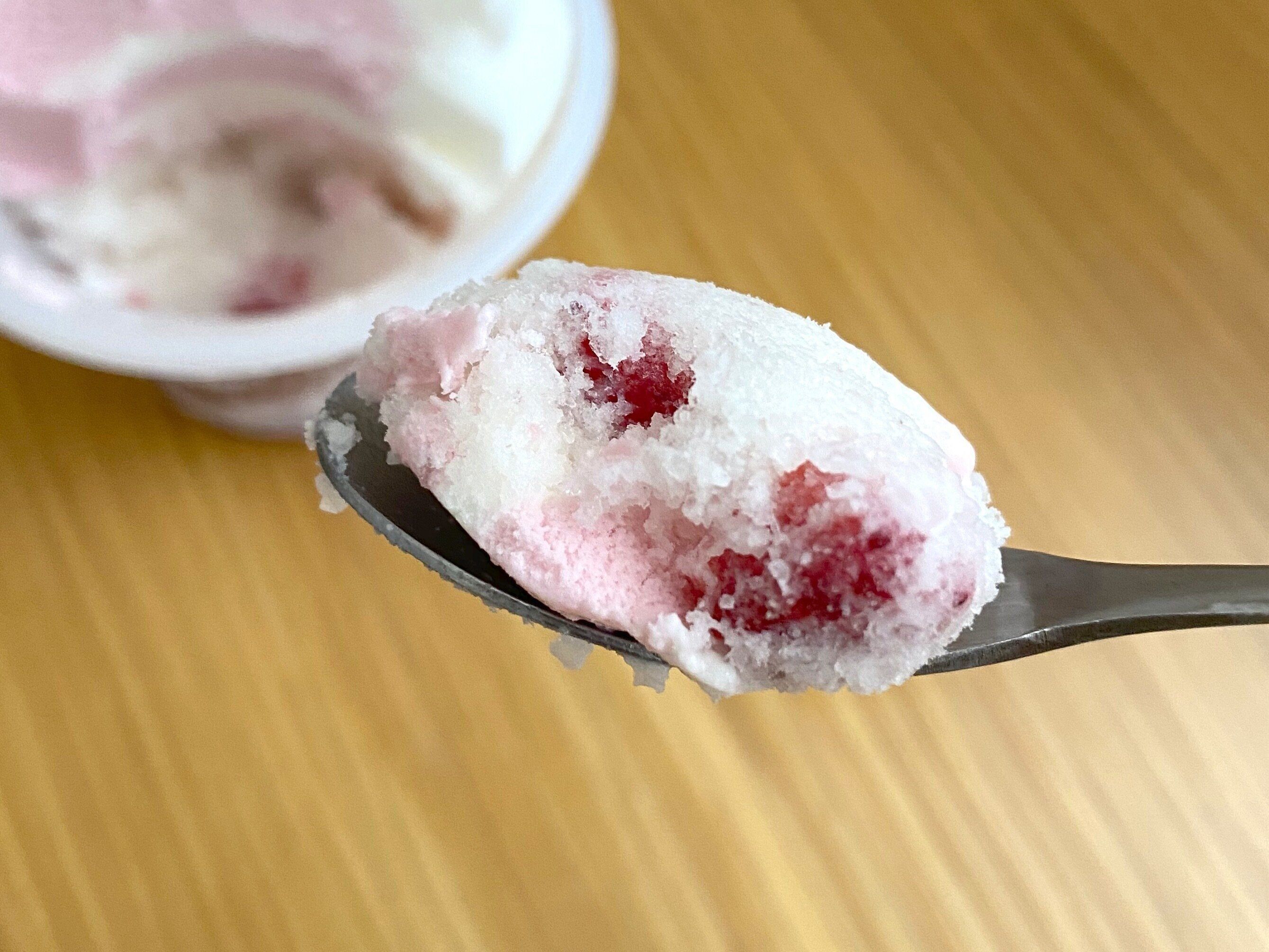 食べ進めると練乳かき氷が登場。ソフトアイスとは違い、シャリシャリ、ガリガリとした食感で、いちご果肉の酸味と果実感が夏の暑い日にピッタリ!