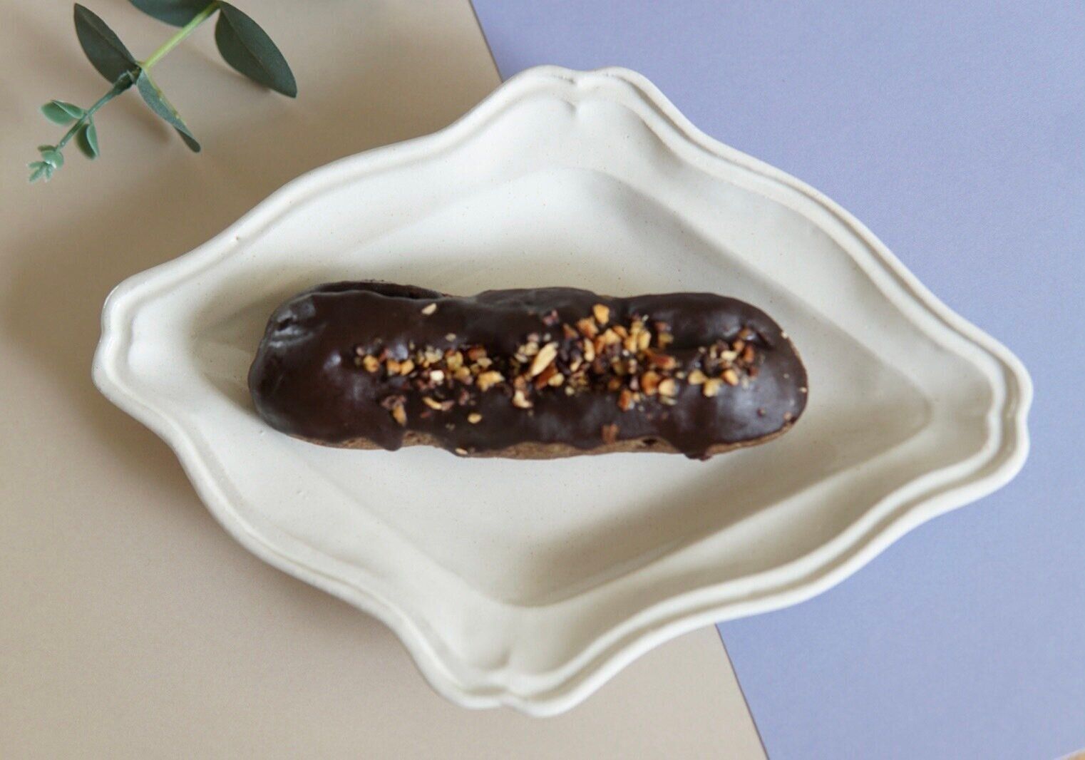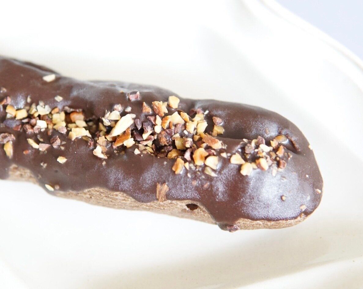 チョコレートが堪能できるエクレア。GODIVAとの共同開発商品です。チョコ風味のパフに、ベルギー産チョコと生クリームを合わせ、コクがありながらもビターな味わいのチョコクリームを注入しました。味と食感のアクセントとしてカカオニブとアーモンドをトッピングしました。