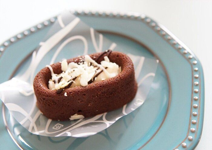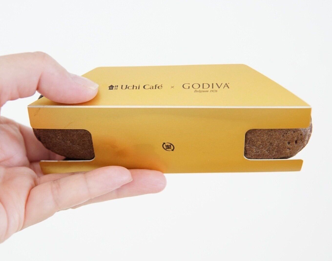 パッケージを開けると、濃厚なチョコの香りが広がります。目の前に現れたのは、ゴールドに光り、Uchi Cafe×GODIVAとプリントされている中敷き。手で持って食べたい方への配慮なのか、両端は真ん中に切り込みのような空間が開いた独特な形状。食べやすいようにとの工夫だと感じました。細部にまで気を配られているのがわかると、おもてなしをされているような気分になり嬉しいです。