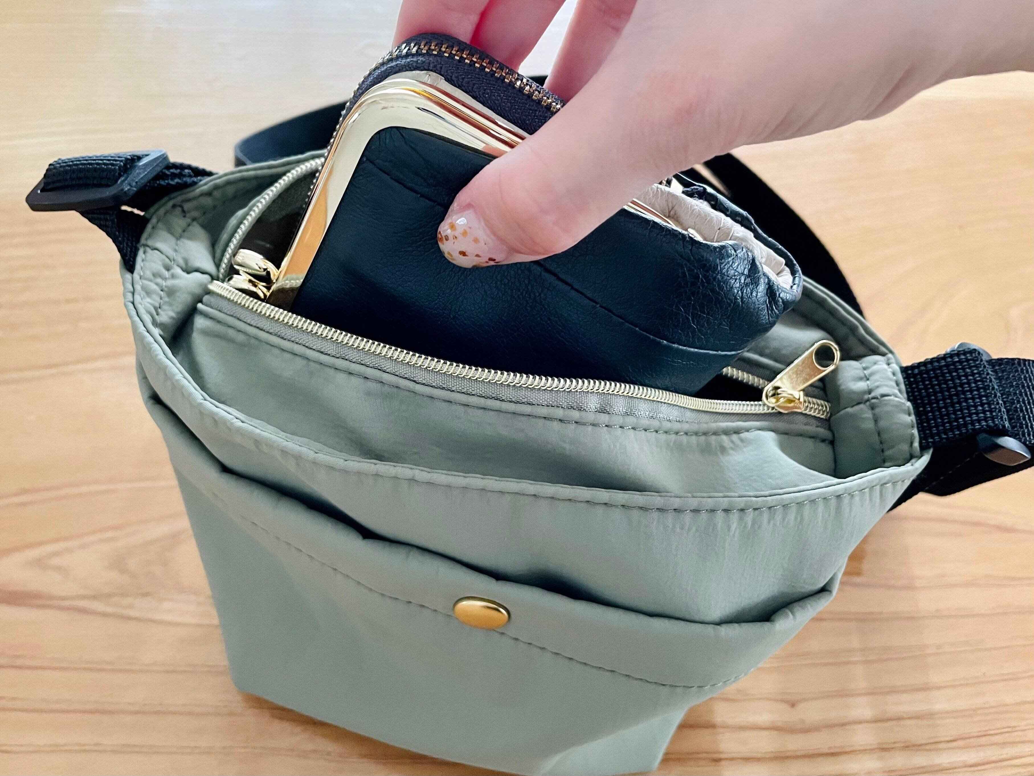 二つ折りの財布も入りましたよ。マチが広いので、見た目以上に容量たっぷり。