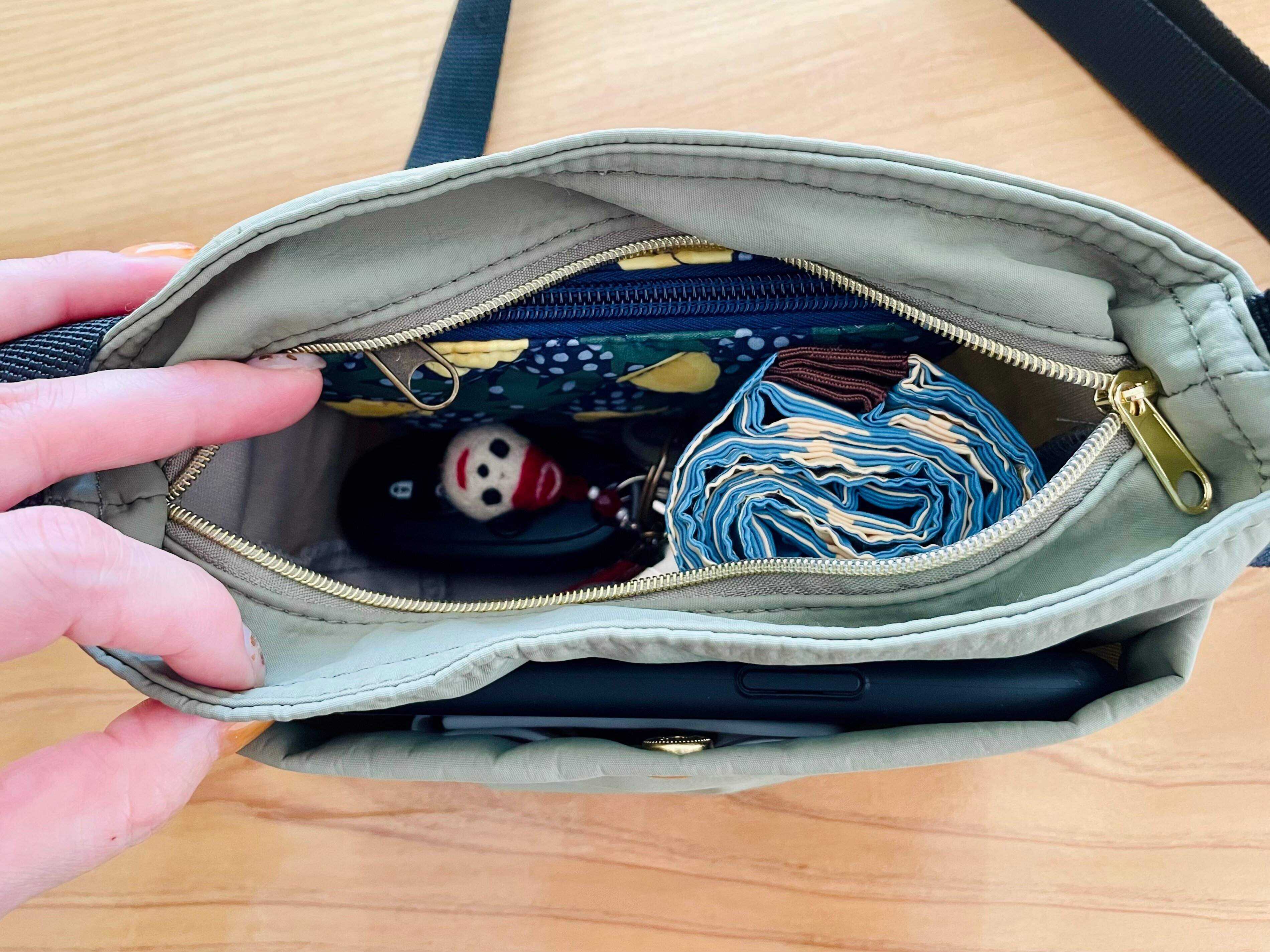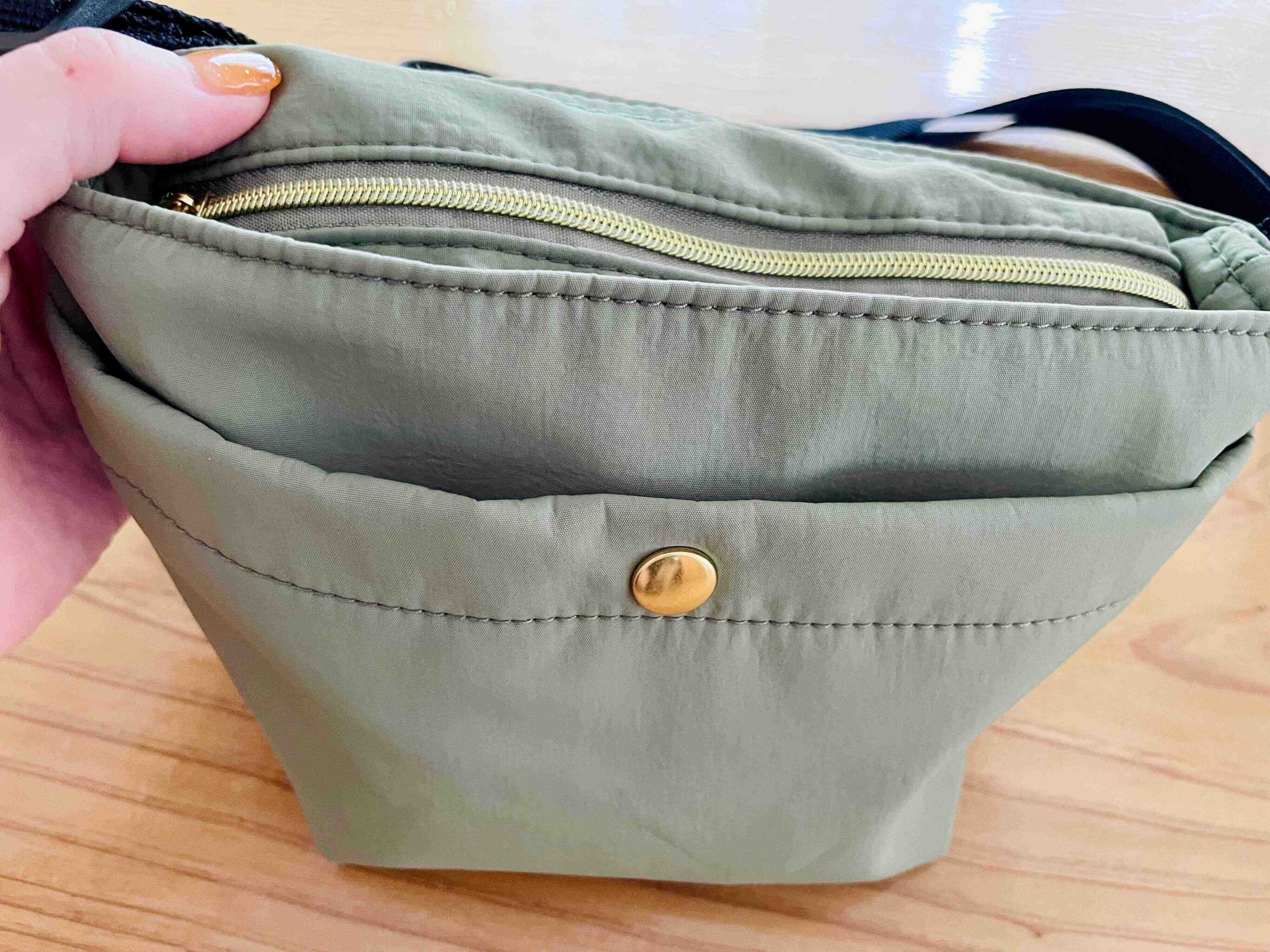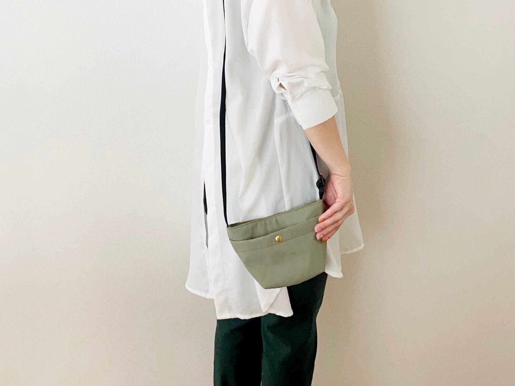 紐はアジャスター付きで、長さ調節が可能。1番長い状態にして肩から掛けると、身長151cmの私で、ヒップの下くらい。