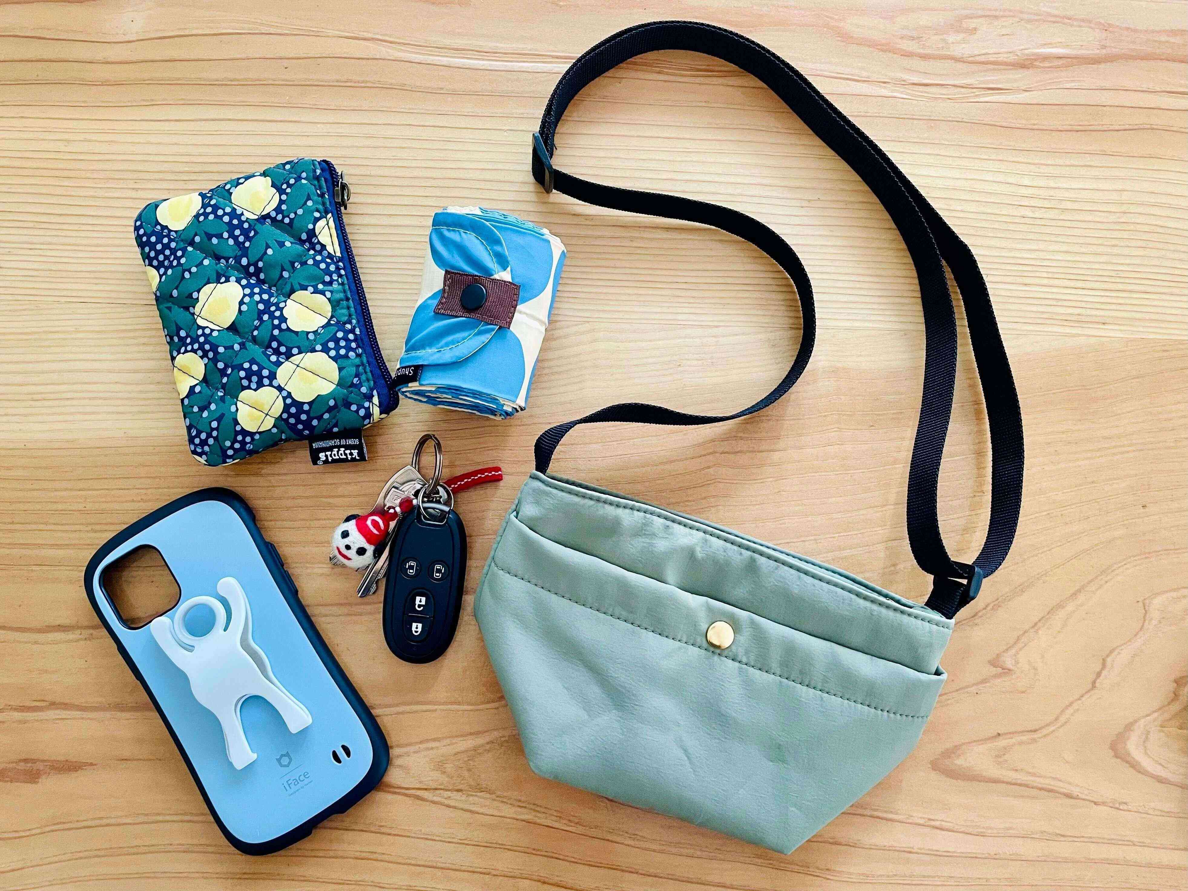 外側のポケットにスマートフォン、メインポケットには小銭入れと鍵、エコバッグ。