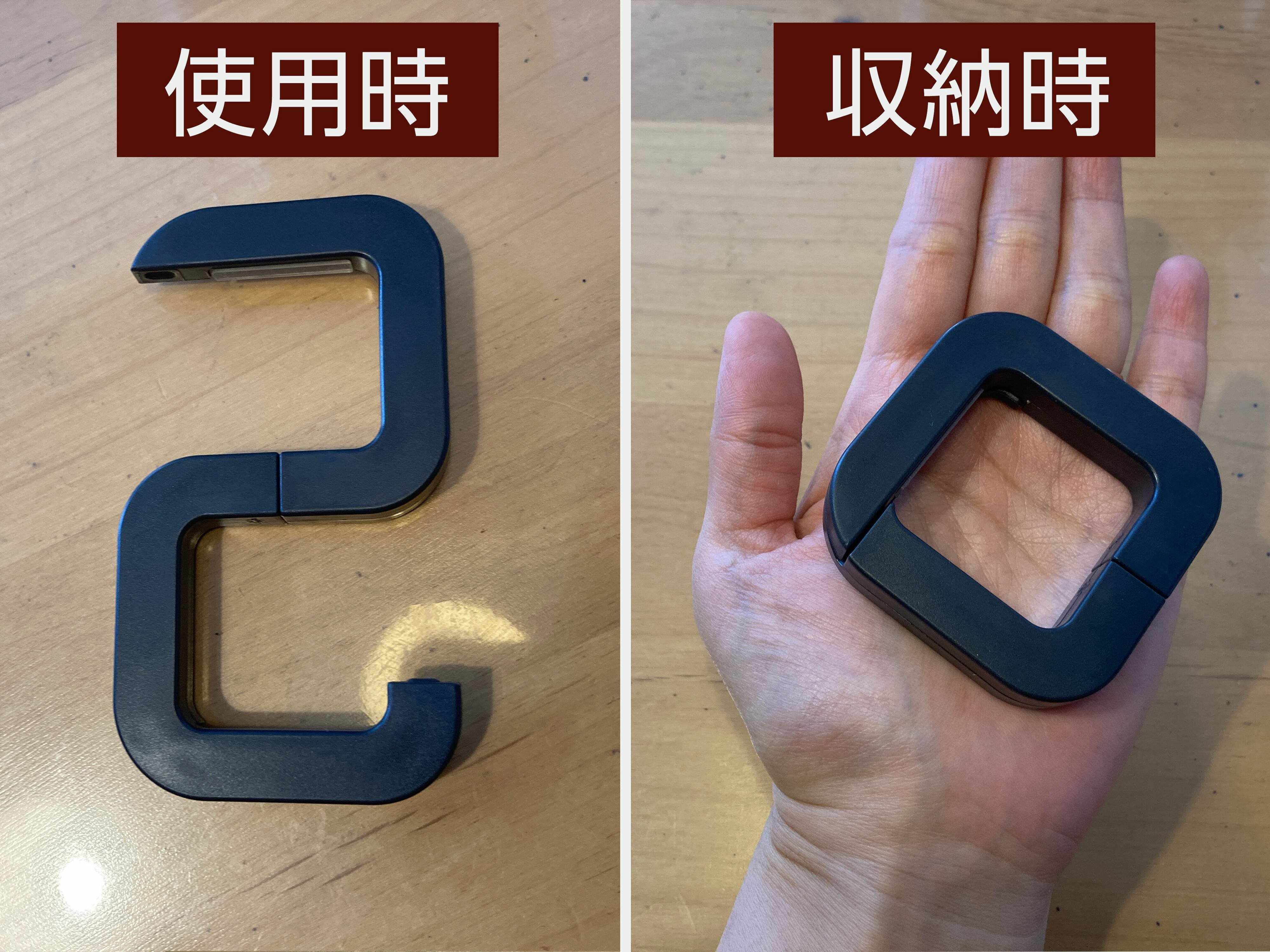 四角く折り畳んで、バッグの持ち手に付けて持ち運べる点もポイントです。