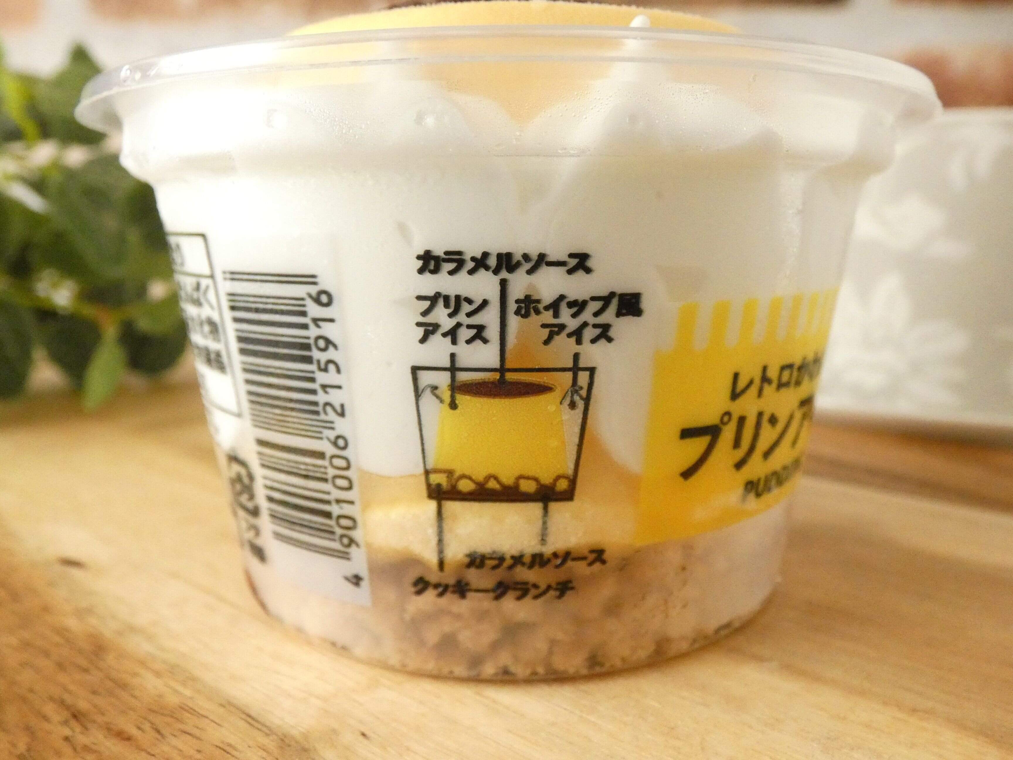 見た目がプリンそっくりなカップアイスで、クッキークランチとカラメルソースの上にプリンアイスが乗っています。プリンのまわりにはホイップクリームのようにバニラアイスが絞ってあり、上にはカラメルソースが乗っています。