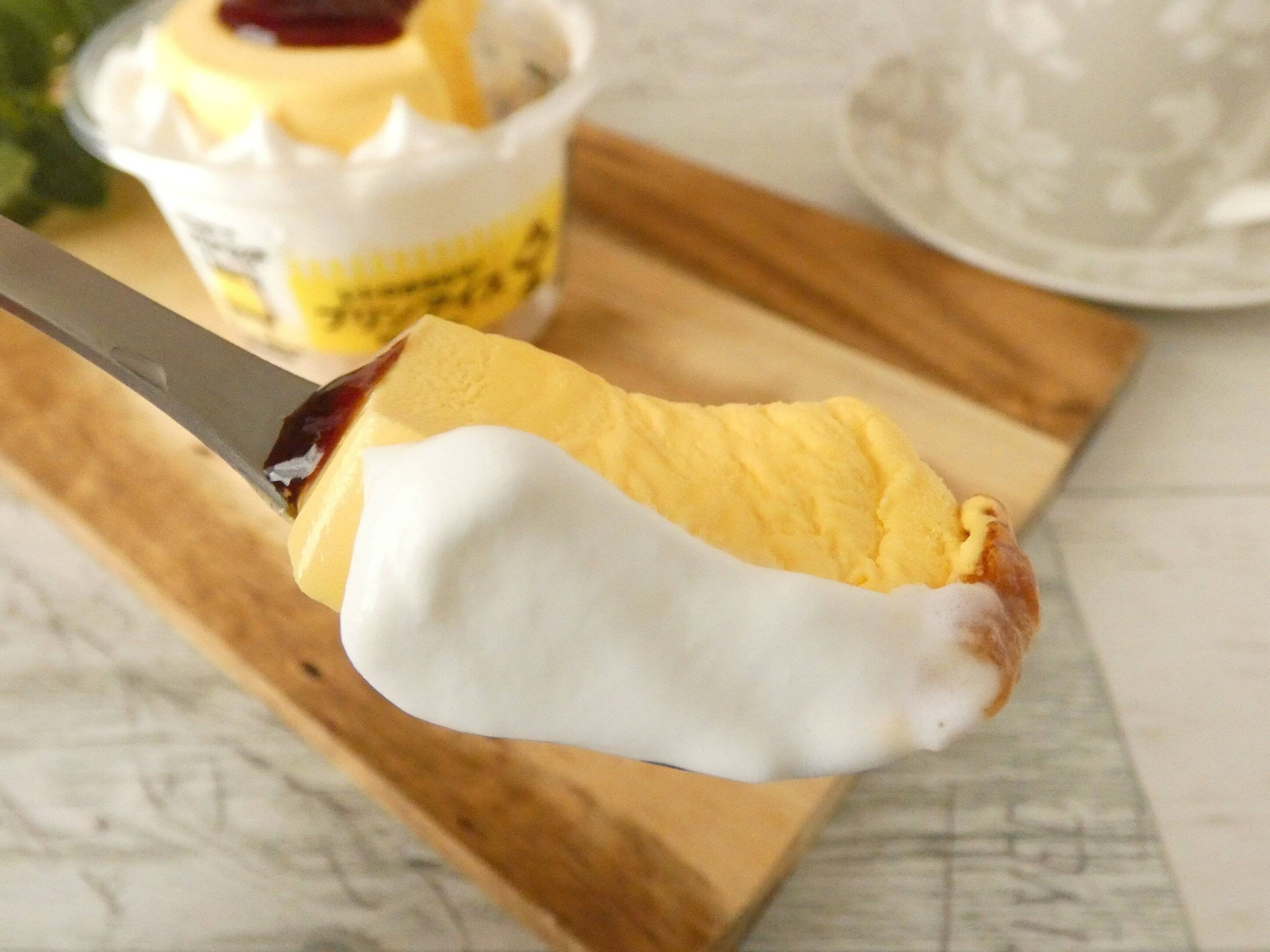 一口食べるとプリンアイスは濃厚なめらかで、カスタードの味わいが広がります。甘さはしっかりありますが、カラメルソースの苦みと香ばしさが合わさるとちょうどいいです。ホイップクリーム風のバニラアイスは軽くてさっぱり。クッキークランチの食感がアクセントになっています。見た目も味もプリンそのもの!内緒にしておきたいおいしさです。