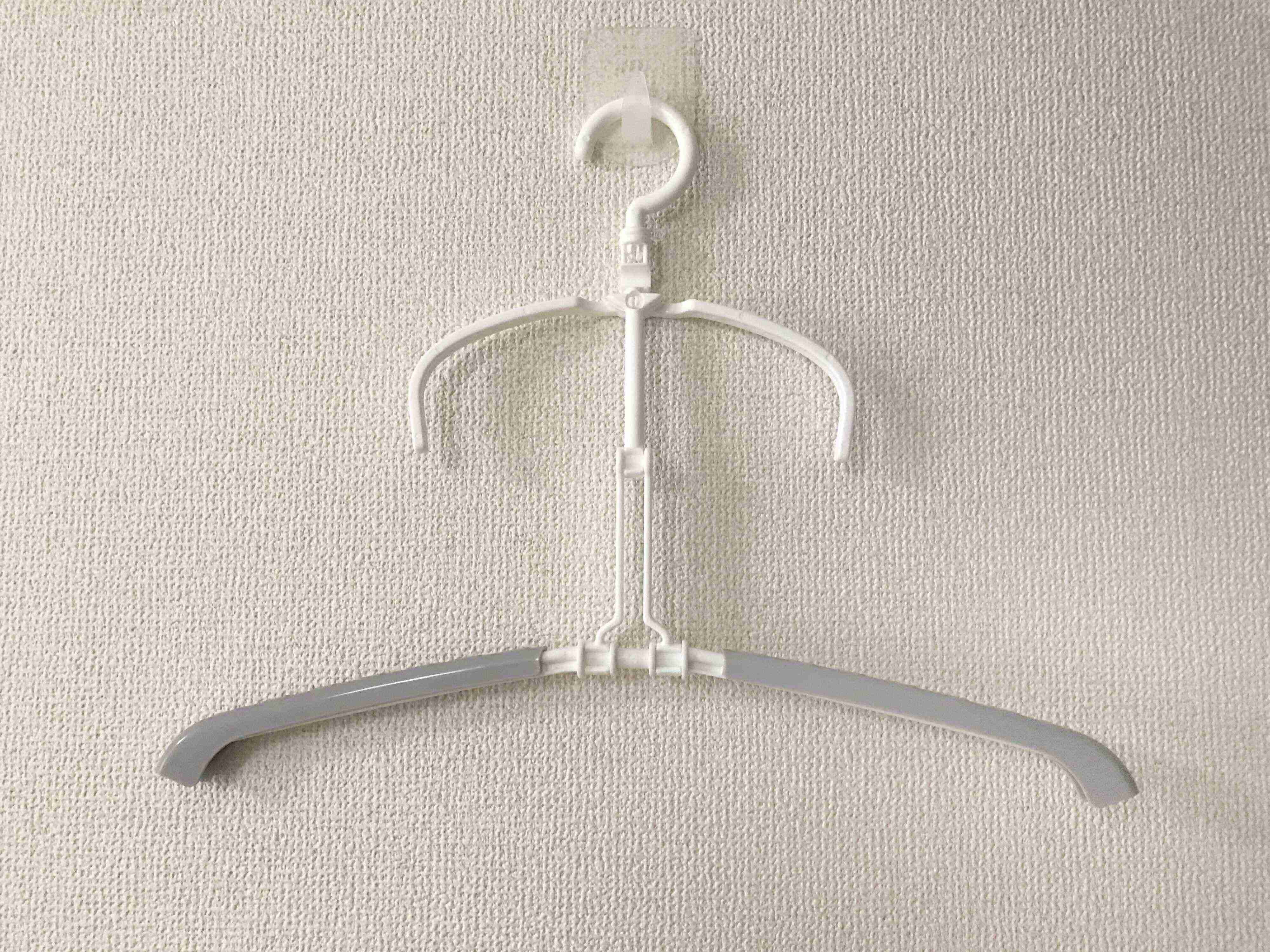広げると割と大き目のサイズ感ですが、収納するときは普通のハンガーのサイズになるので場所をとることもありません。もちろんフード付きのお洋服以外の洗濯にも使用できます。