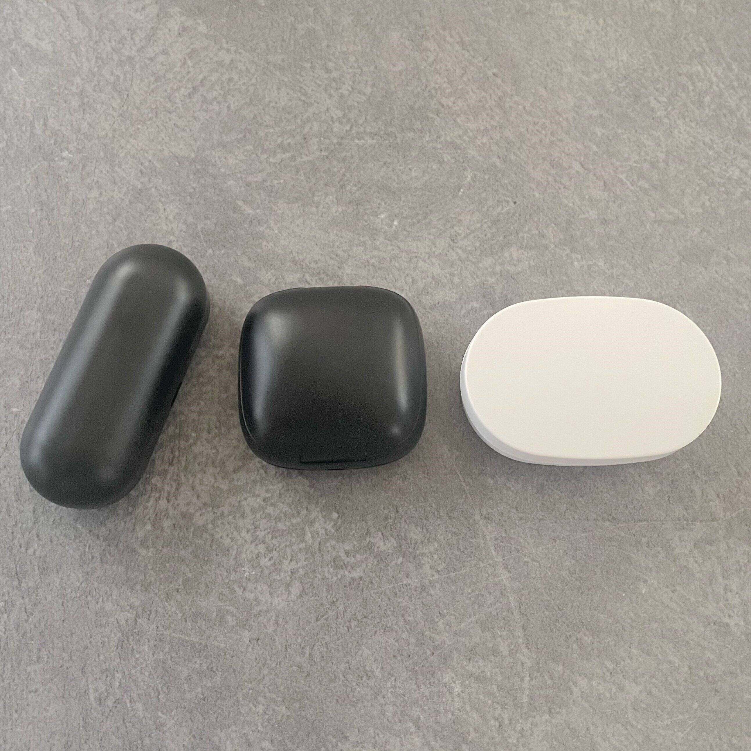 左が初めてダイソーで販売されたワイヤレスイヤホン。ブラックボディで俵型のケースが特徴です。