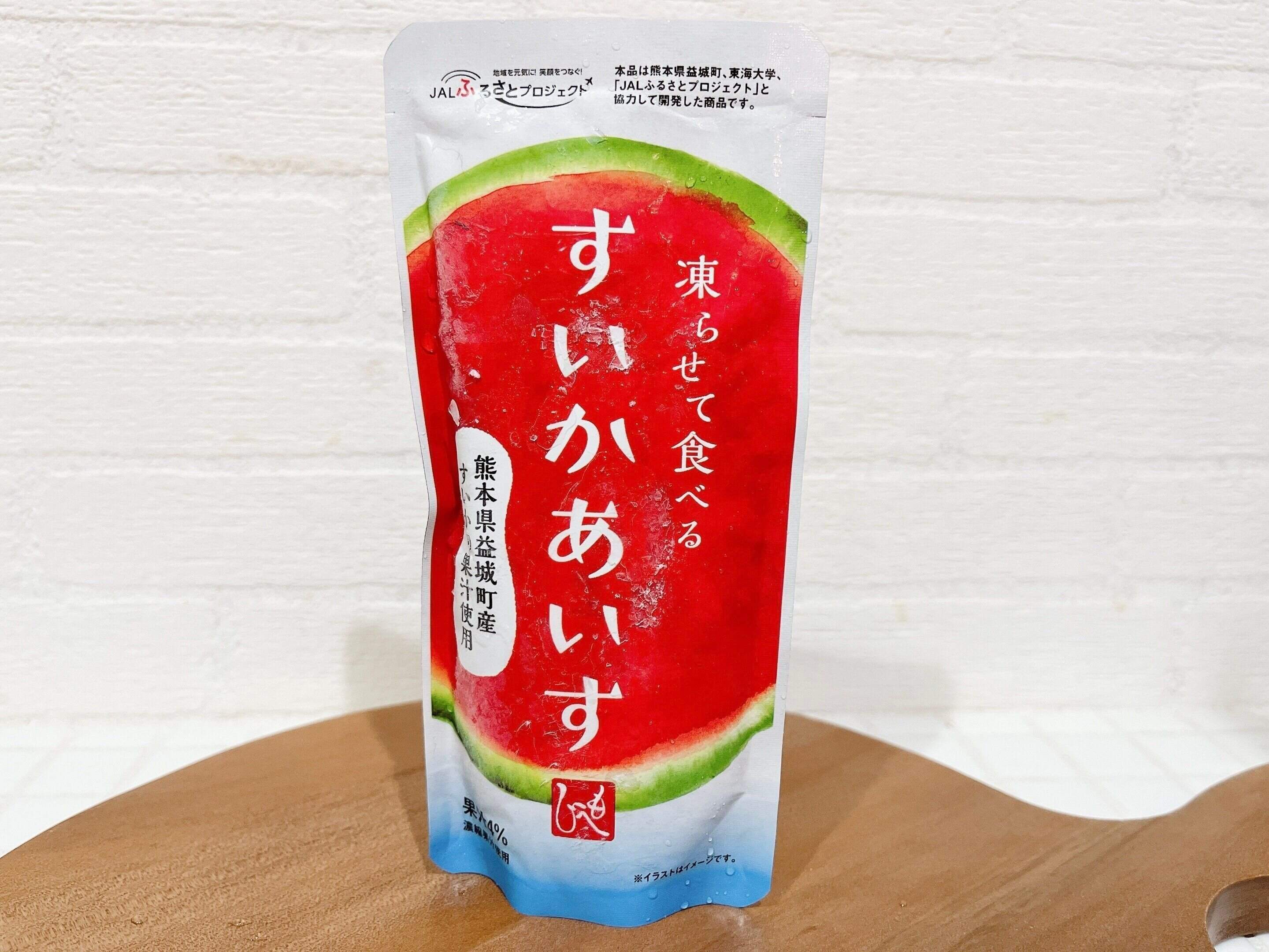 すいかの自然な甘みと風味をそのまま味わうことができ、凍らせた本品を炭酸水やお酒に入れるなどアレンジ自在のアイスです。熊本県益城町産スイカ果汁を4%使用して仕上げられています。