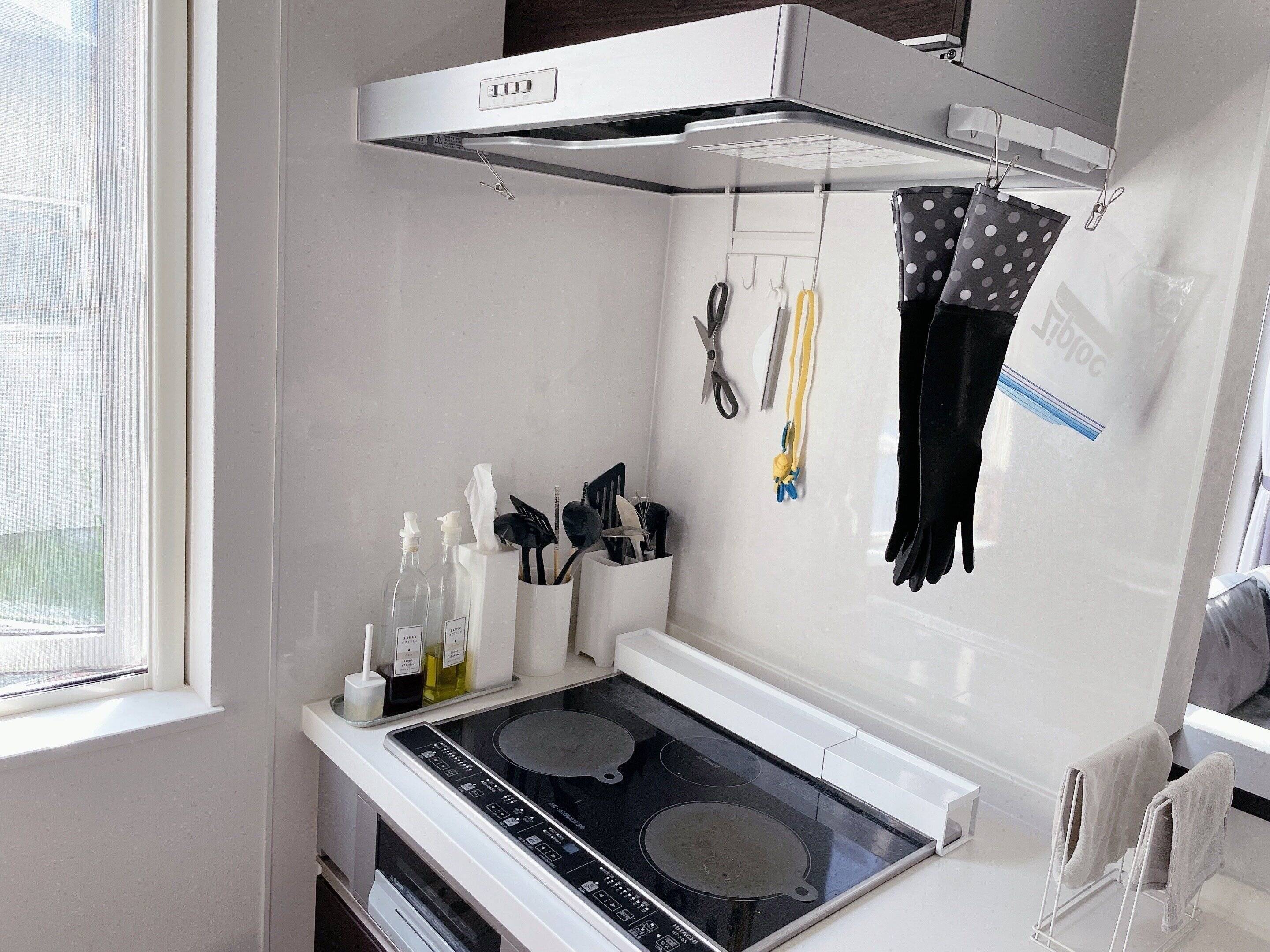 キッチンの換気扇、冷蔵庫の整理整頓、カトラリー収納の拭き掃除。
