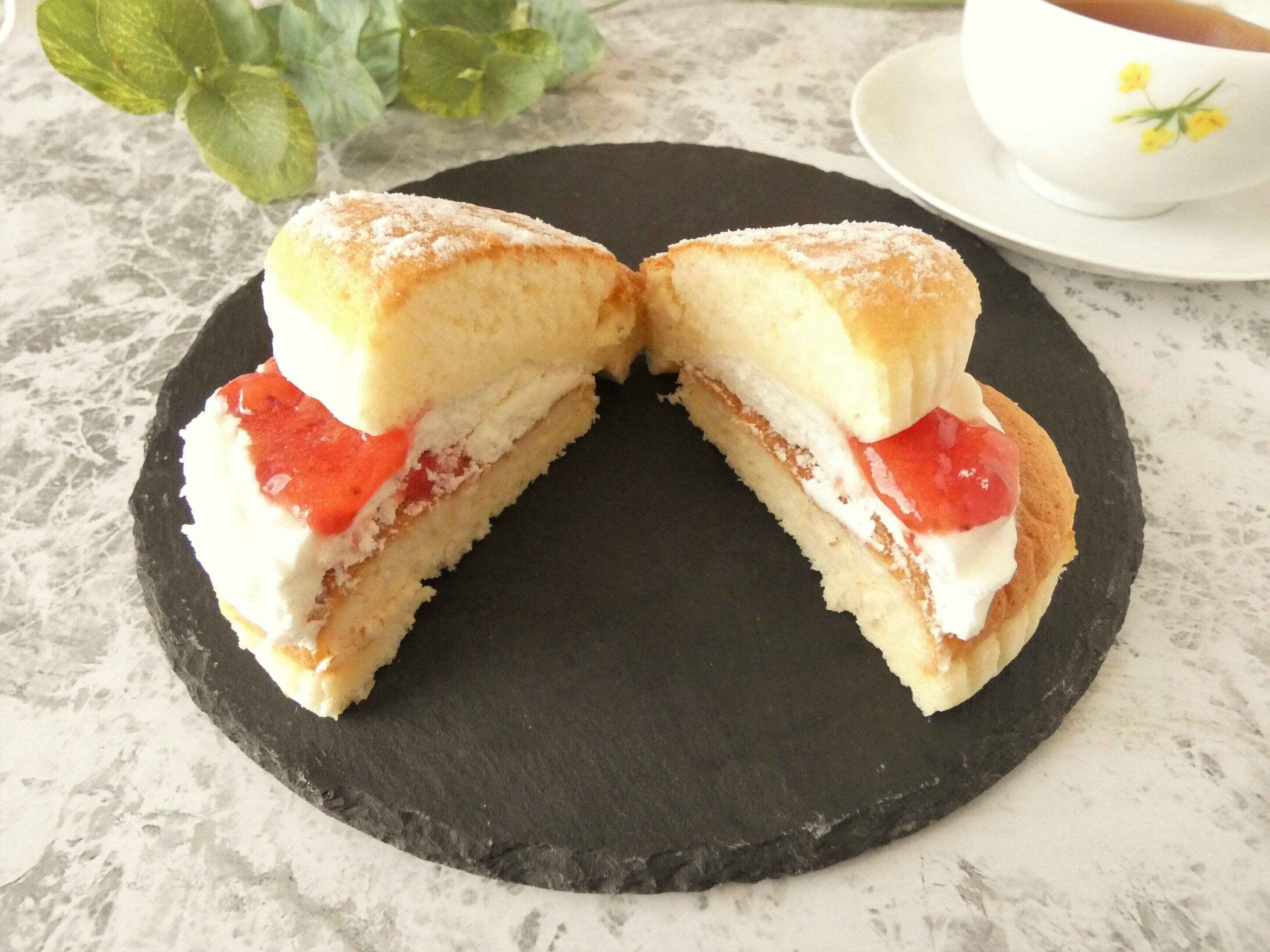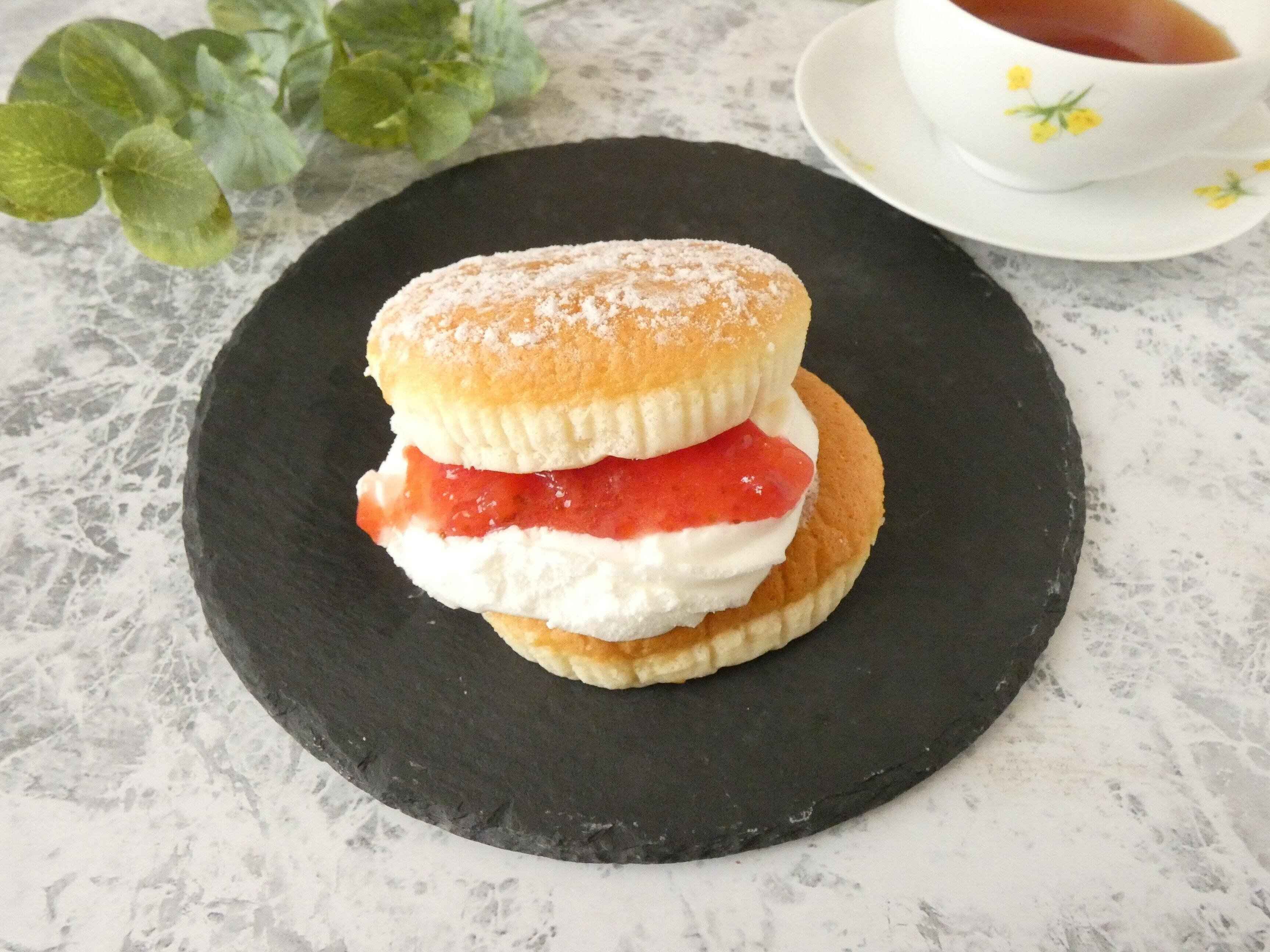 ふんわりとしたパンケーキに、たっぷりのホイップクリームといちごソースがサンドしてあり、上には粉砂糖が振ってあります。