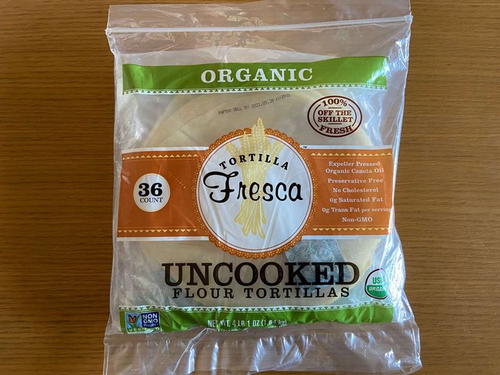 こちらは冷蔵コーナーで販売されている、焼いていないタイプの「有機アンクックドトルティーヤ」です。通常価格は1,268円ですが、賞味期限間近で377円という破格の安さでGETすることができました。36枚も入っているので、すぐに食べないぶんは冷凍保存も可能。