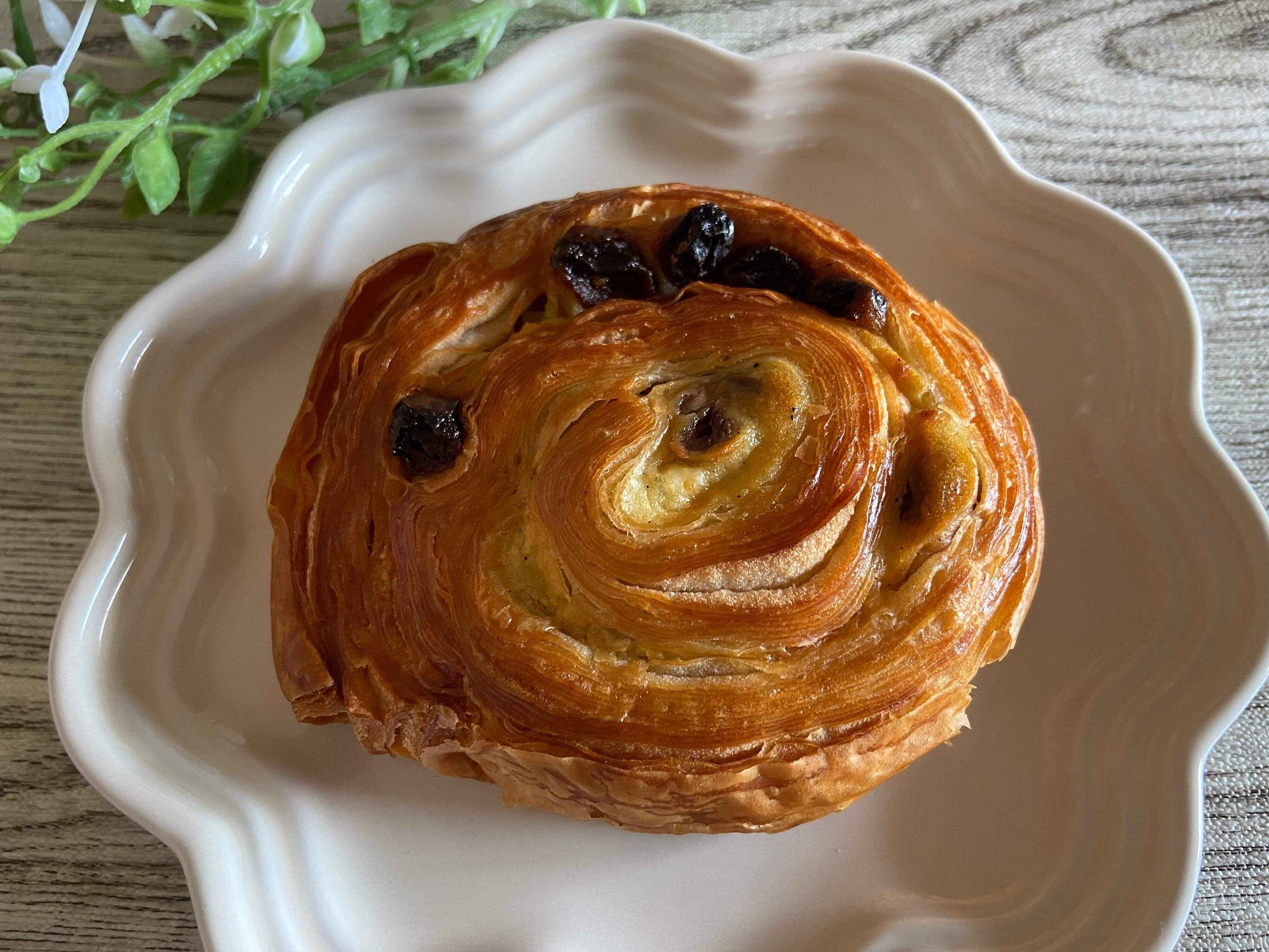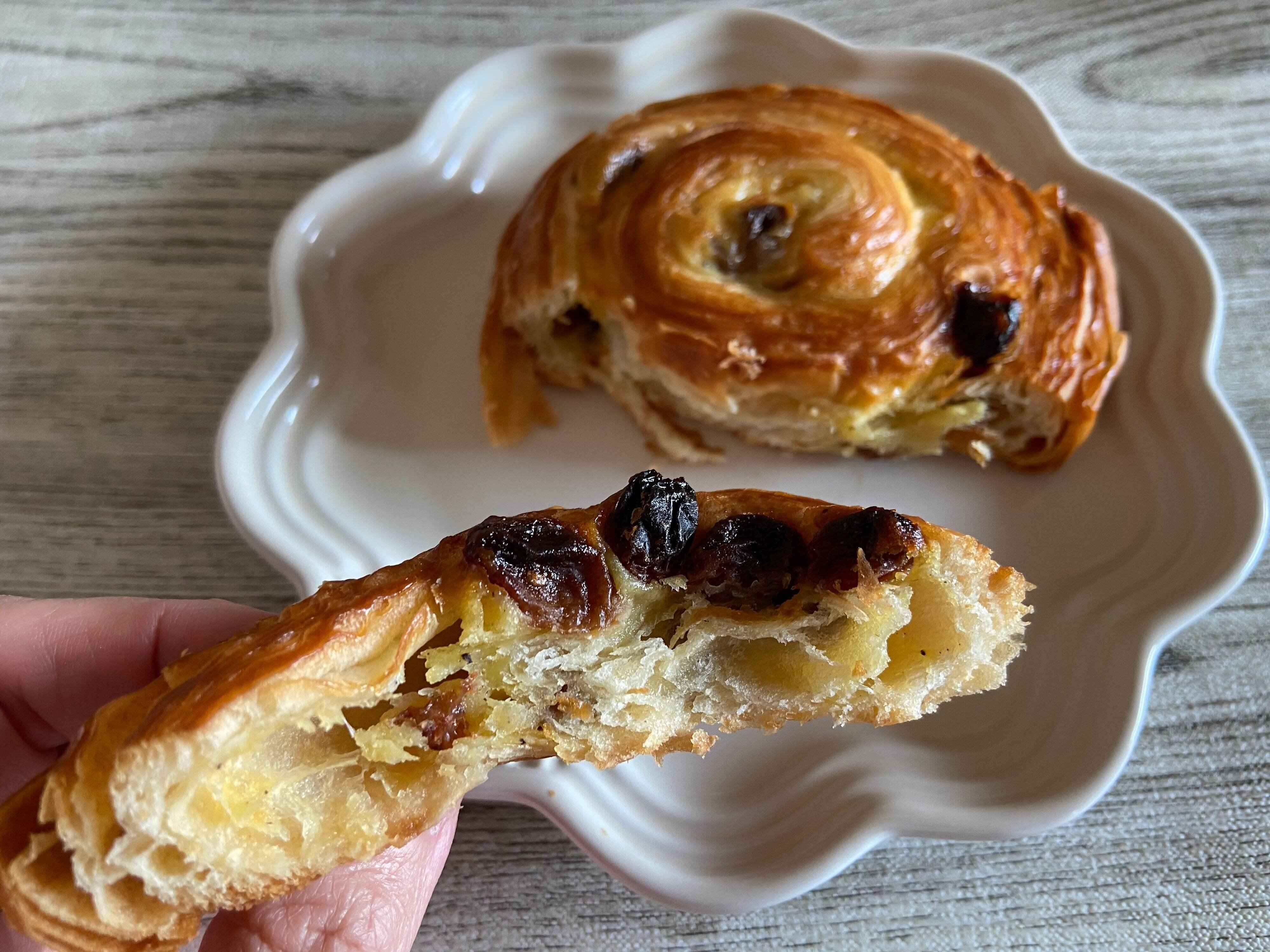 しっとりしたデニッシュ生地にほどよい甘さとコクのあるカスタードのバランスがよく、とってもおいしいです。ところどころに入った大粒でジューシーなレーズンがアクセントに。