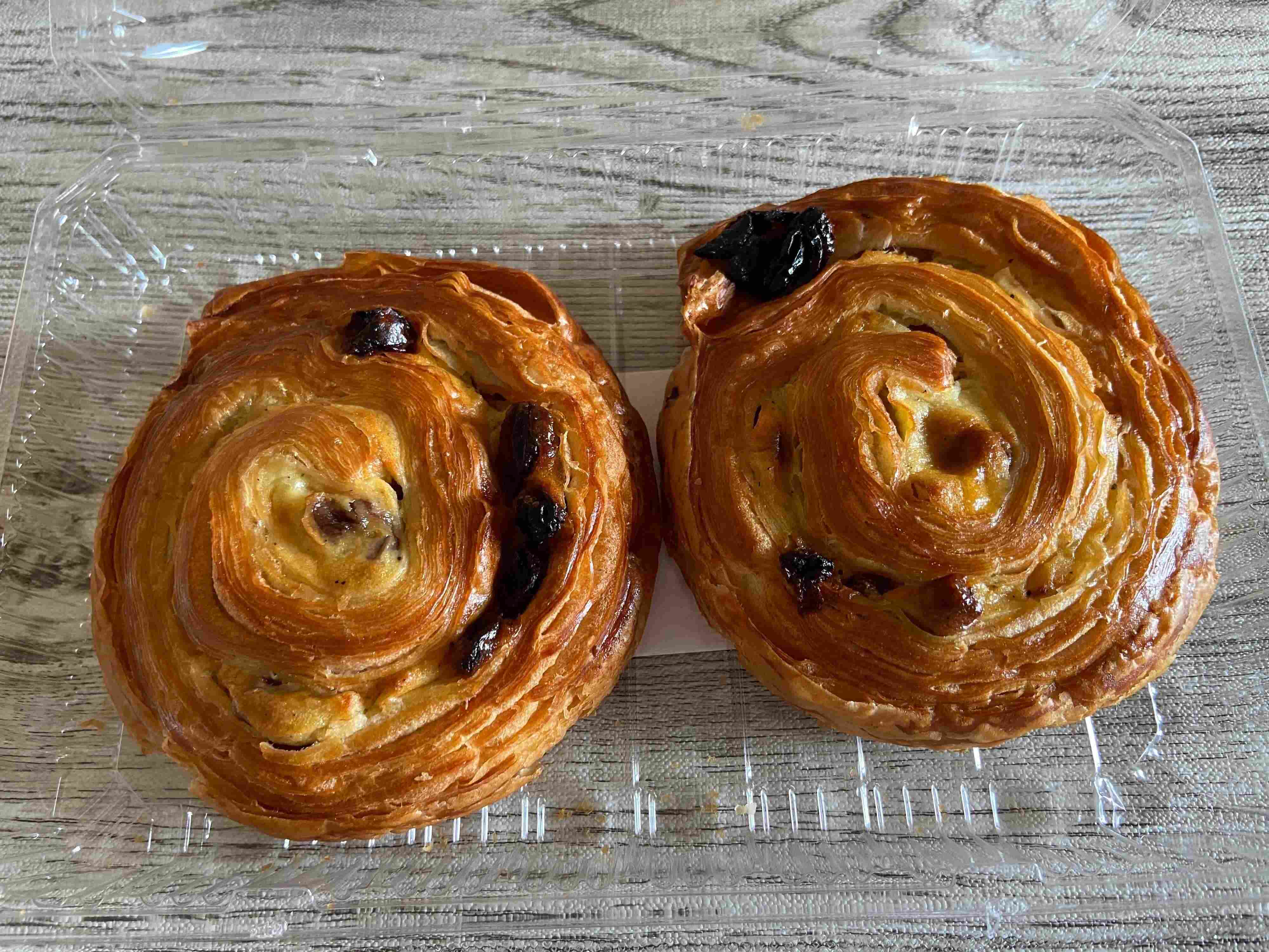 発酵バターのいい香りがします。くるくるうずまき状のデニッシュは層になっていて大粒のレーズンも入ってとってもおいしそう。