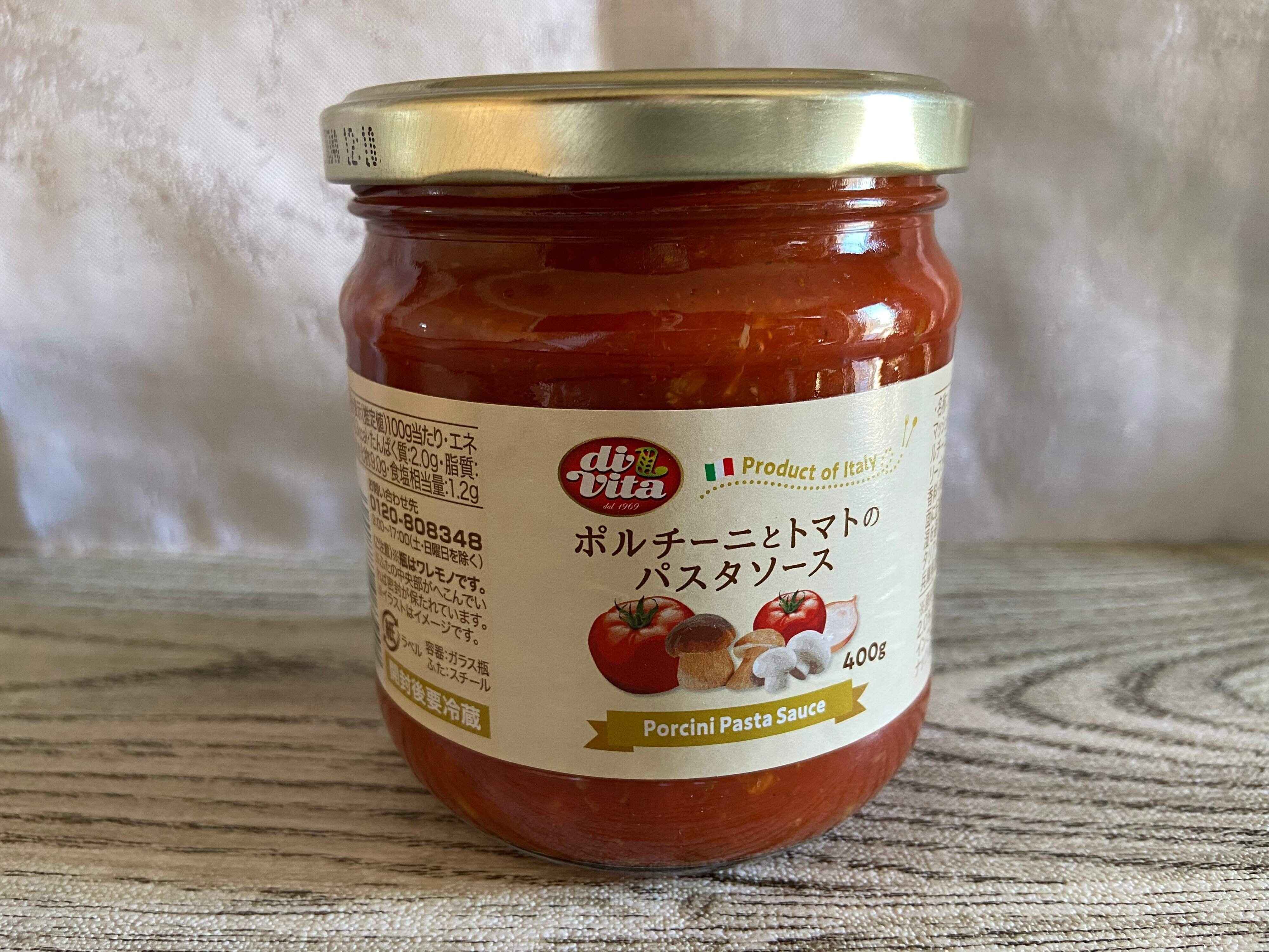 まずはこちら「ポルチーニとトマトのパスタソース」(購入時:278円)が使い勝手がよく便利でおいしいのでおすすめ。