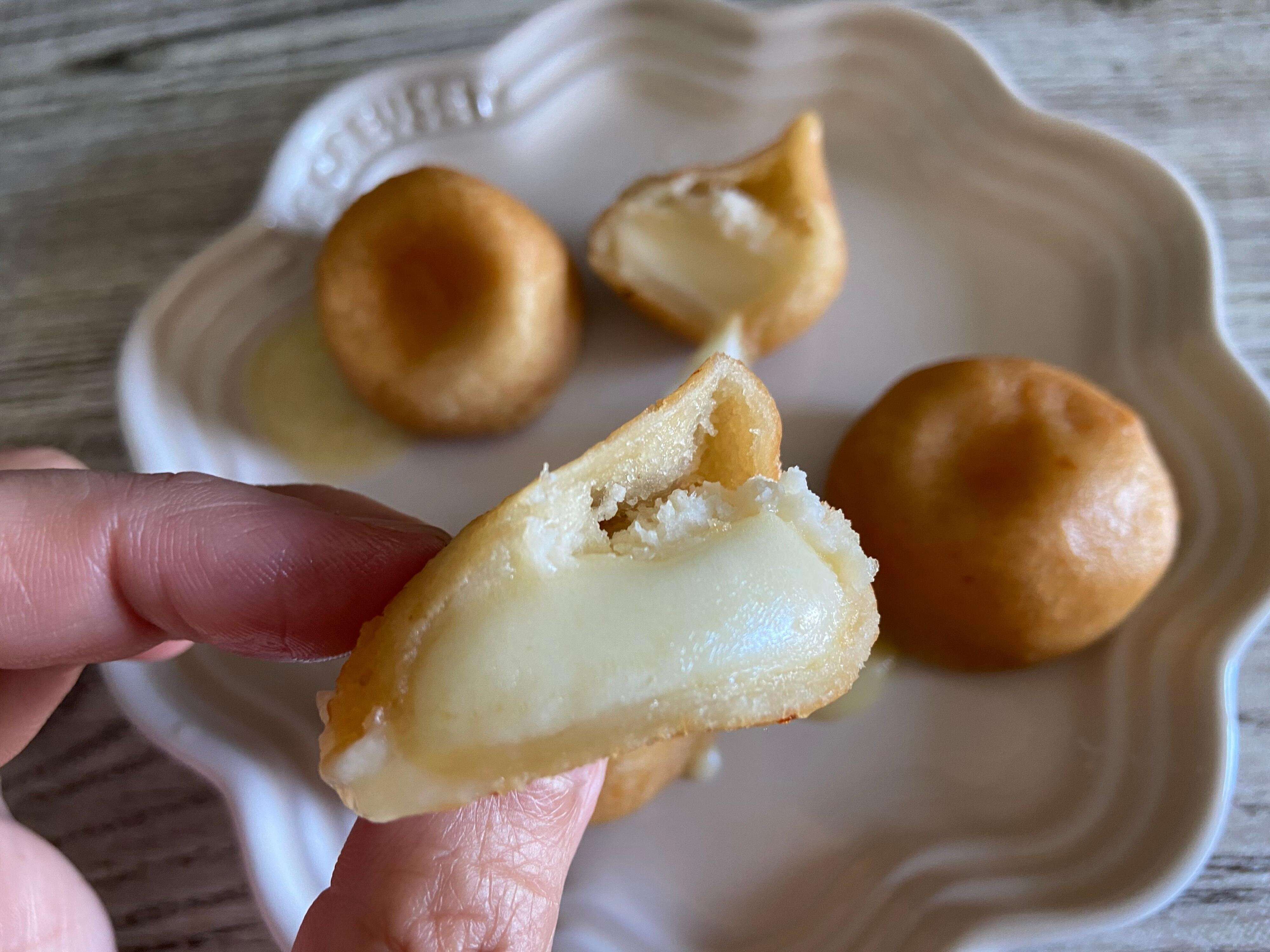 中からチーズが飛び出してしまったものもありますが...食べてみると予想以上にもっちもちの生地がおいしい!もち米や米粉が使われているほんのり甘い生地の中にはとろ~りクリームチーズが。