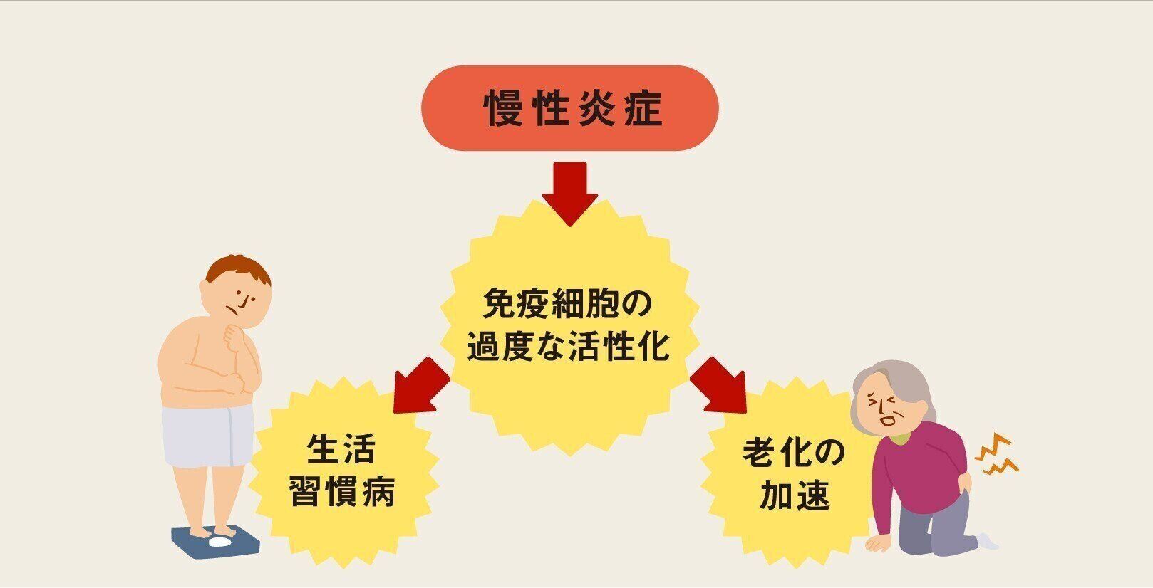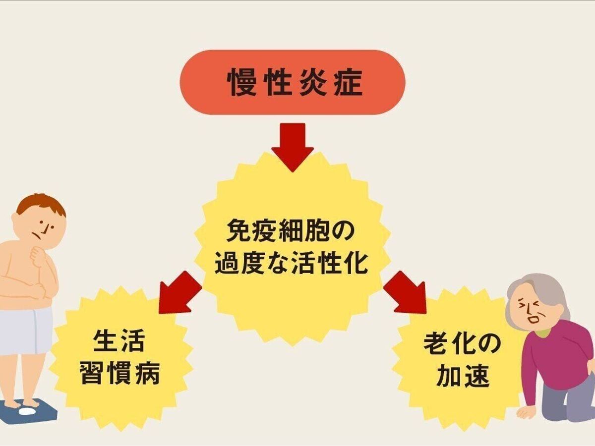 そもそも「炎症」は体の防御反応の1つで、体内の異物や異常な状態を取り除き元の状態に戻すための働きです。炎症には「急性炎症」と「慢性炎症」の2つがあり、急性炎症はのどの痛みや口内炎、皮膚炎など、症状が出てから短時間で治るもの。慢性炎症は多くは無症状で、体の中で長期に続く慢性的な炎症です。