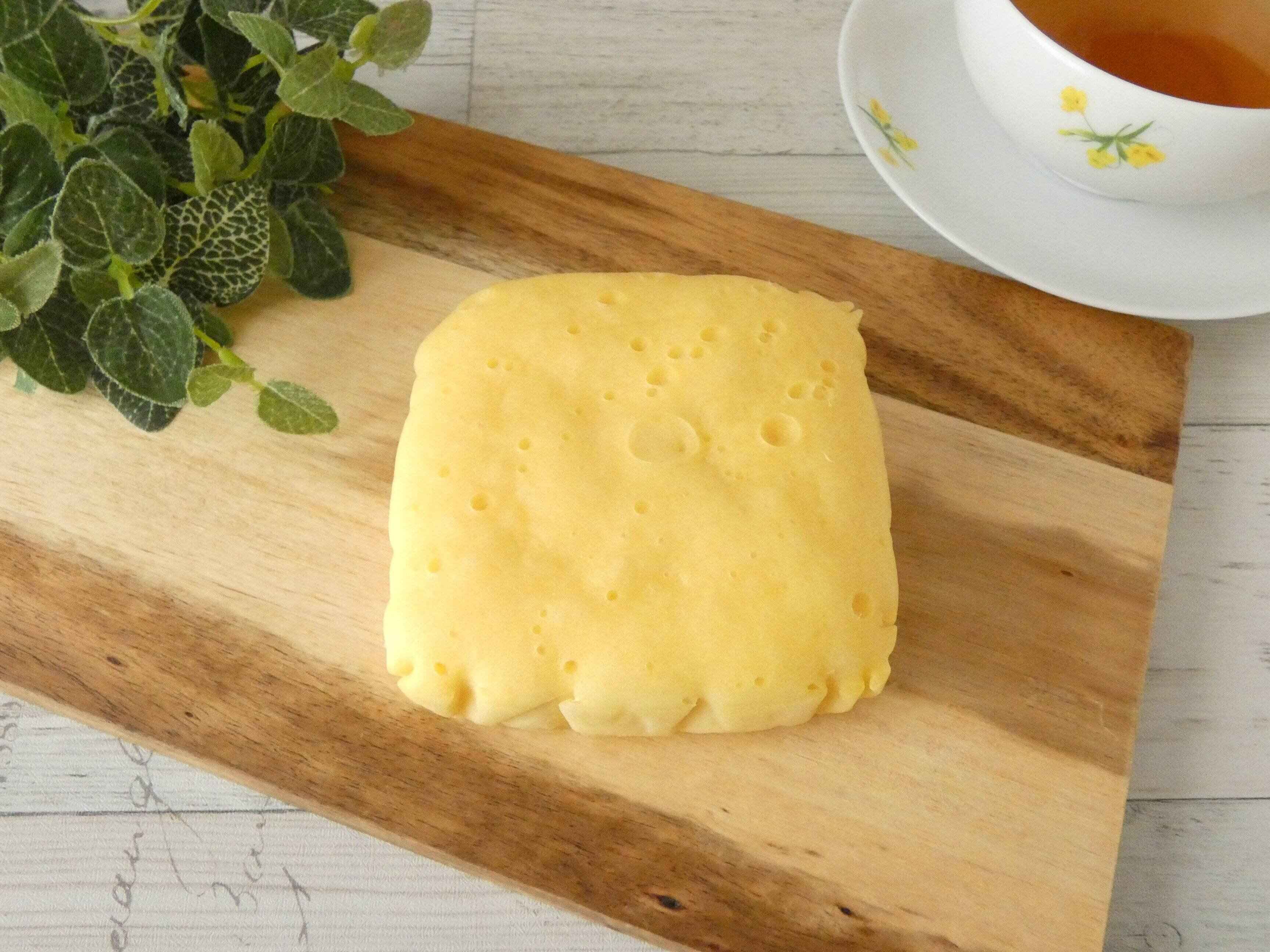 牛のイラストが目にとまる黄色のパッケージで、開けるとバターの香りが広がります。ほんのり黄色い蒸しケーキはずっしりしています。