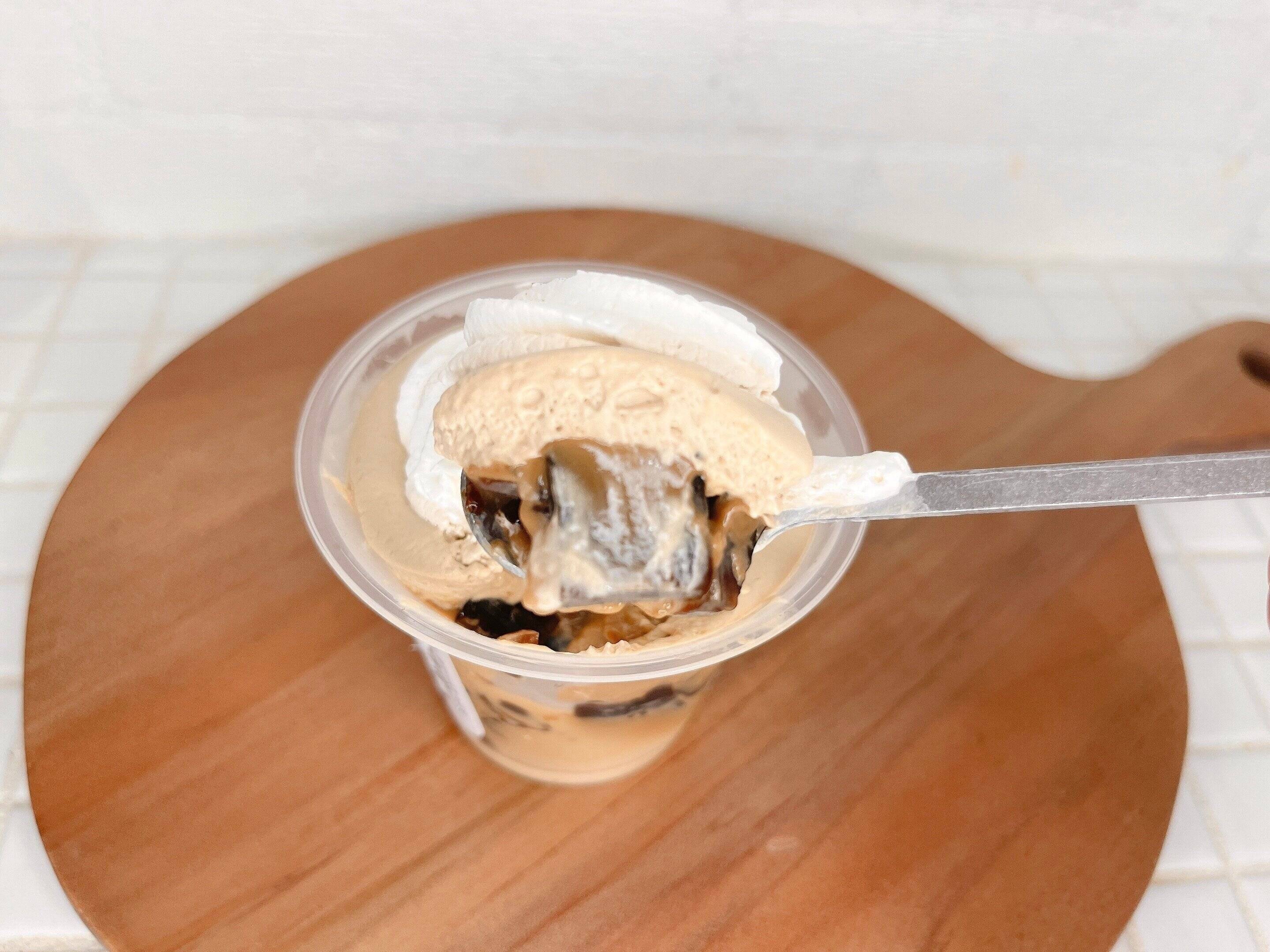 コーヒーゼリーのほろ苦さ、コーヒー牛乳の甘さ、コーヒームースの柔らかさ、ホイップのスイーツ感、全て口の中で合わさり、とってもバランスのいいコーヒーゼリースイーツに仕上がっていて、絶品です。全て混ざるとカフェオレのような味わいに。