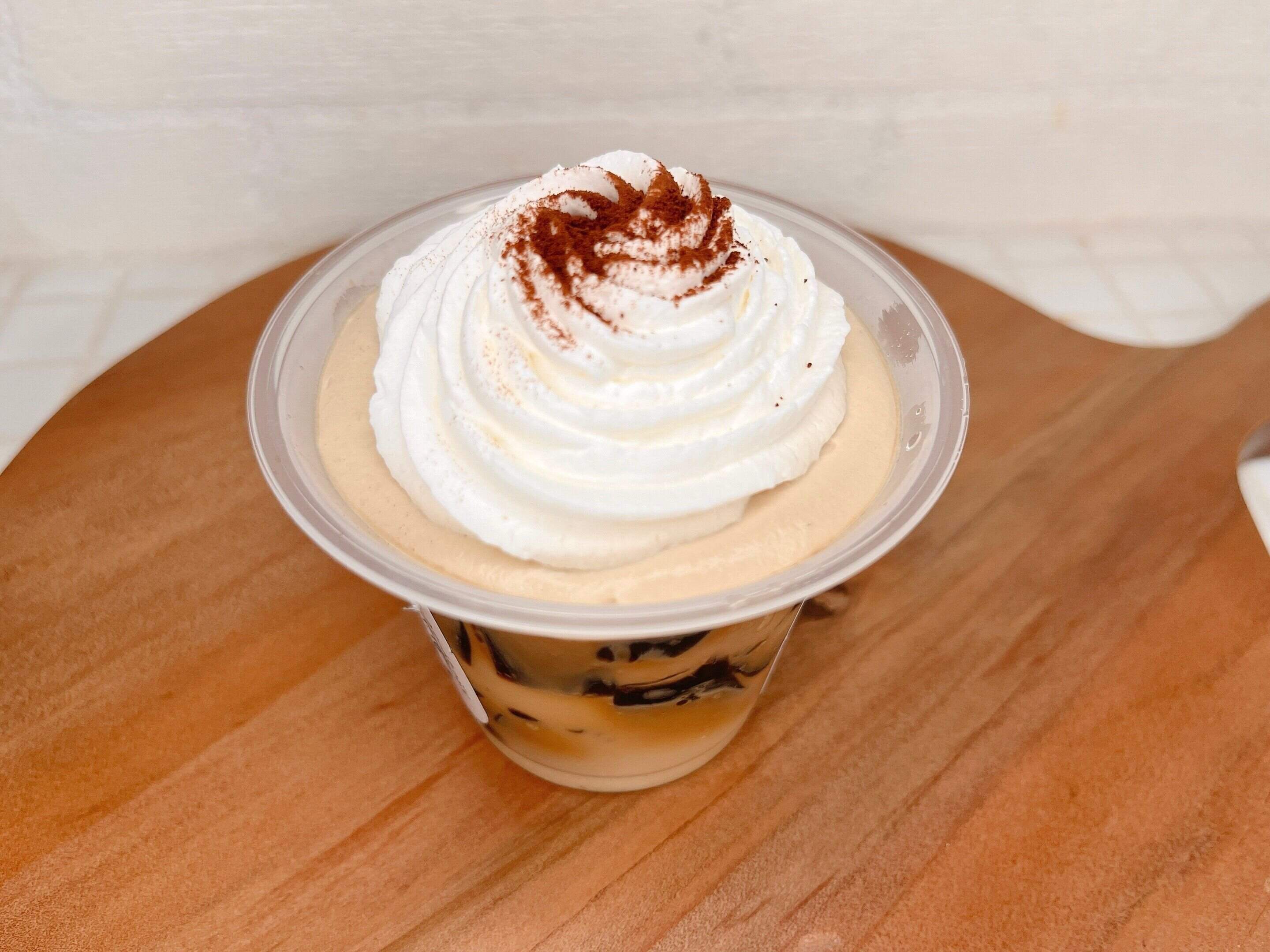 コーヒー牛乳プリンの中に角切りになっているコーヒーゼリーが混ざっていて、その上に更にコーヒームースと、とにかくコーヒーづくしのスイーツです!