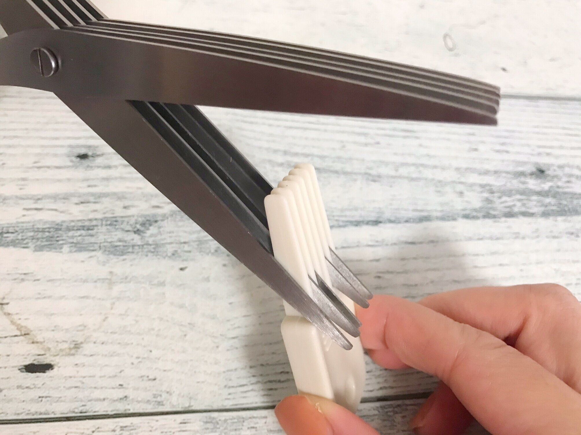 洗うのめんどくさい形じゃない?と思った人も安心してください。みじん切りはさみには専用のお手入れアイテムがセットになっているので、刃の間に詰まった食材も簡単に取り除けますし、洗剤をつけてから使えば洗い物もそこまで大変ではありません。おすすめはスプレータイプの洗剤をシュッシュッと本体にかけて付属のお手入れグッズを使う方法です。