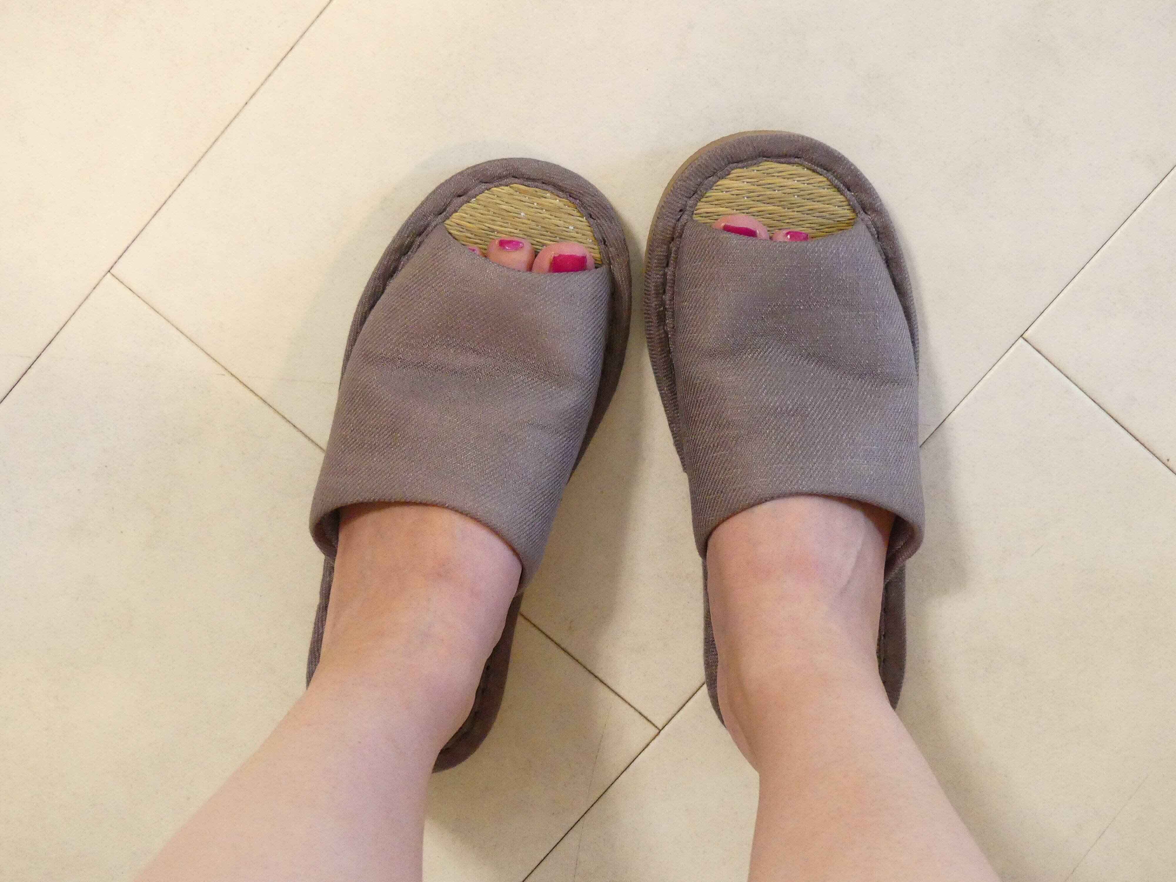 私のように裸足で履いてもOK、冷え対策で靴下を履いてからつかっても快適なイ草スリッパ。