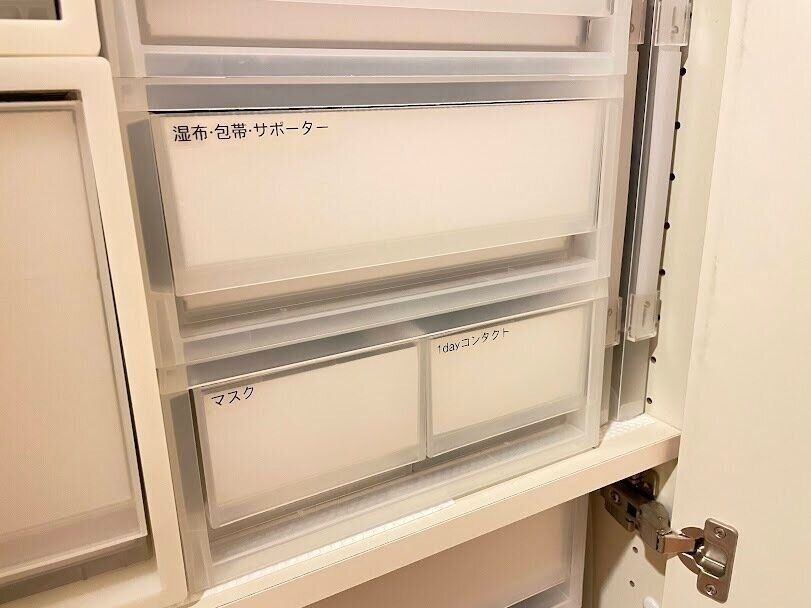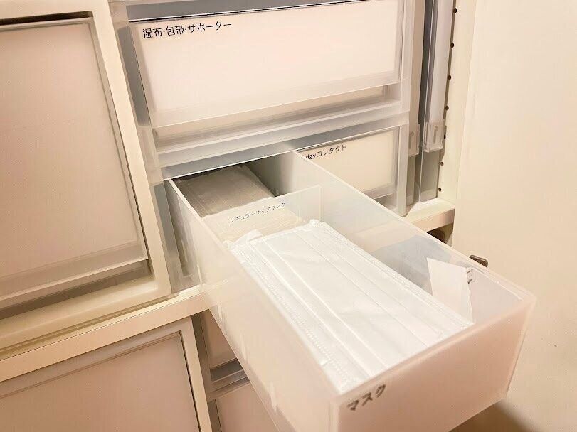 引出し式浅型タイプのケースは、使い捨てコンタクトレンズだけでなく、マスク収納にもぴったりなんです!我が家では不織布使い捨てマスクをレギュラーサイズと小さめサイズの2種類を分けて収納しています。こちらも、ケースを引き出したらサッと取り出せるので、すごく便利ですよ。ぜひ参考にして頂けたら嬉しいです。