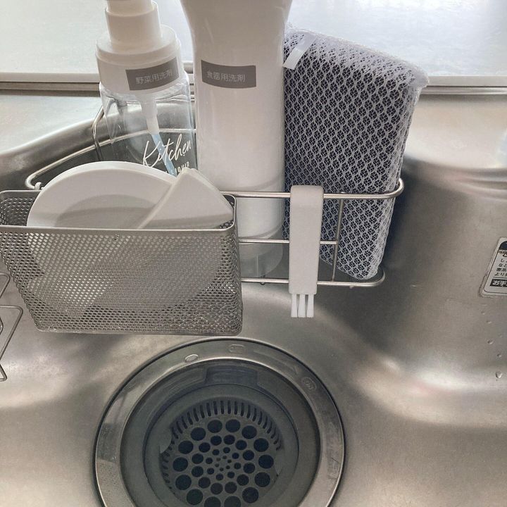 このブラシいちばんのおすすめ!水切りカゴなどに引っ掛けることができる形状になっています。あっても良さそうなのに……今までなかったのです。