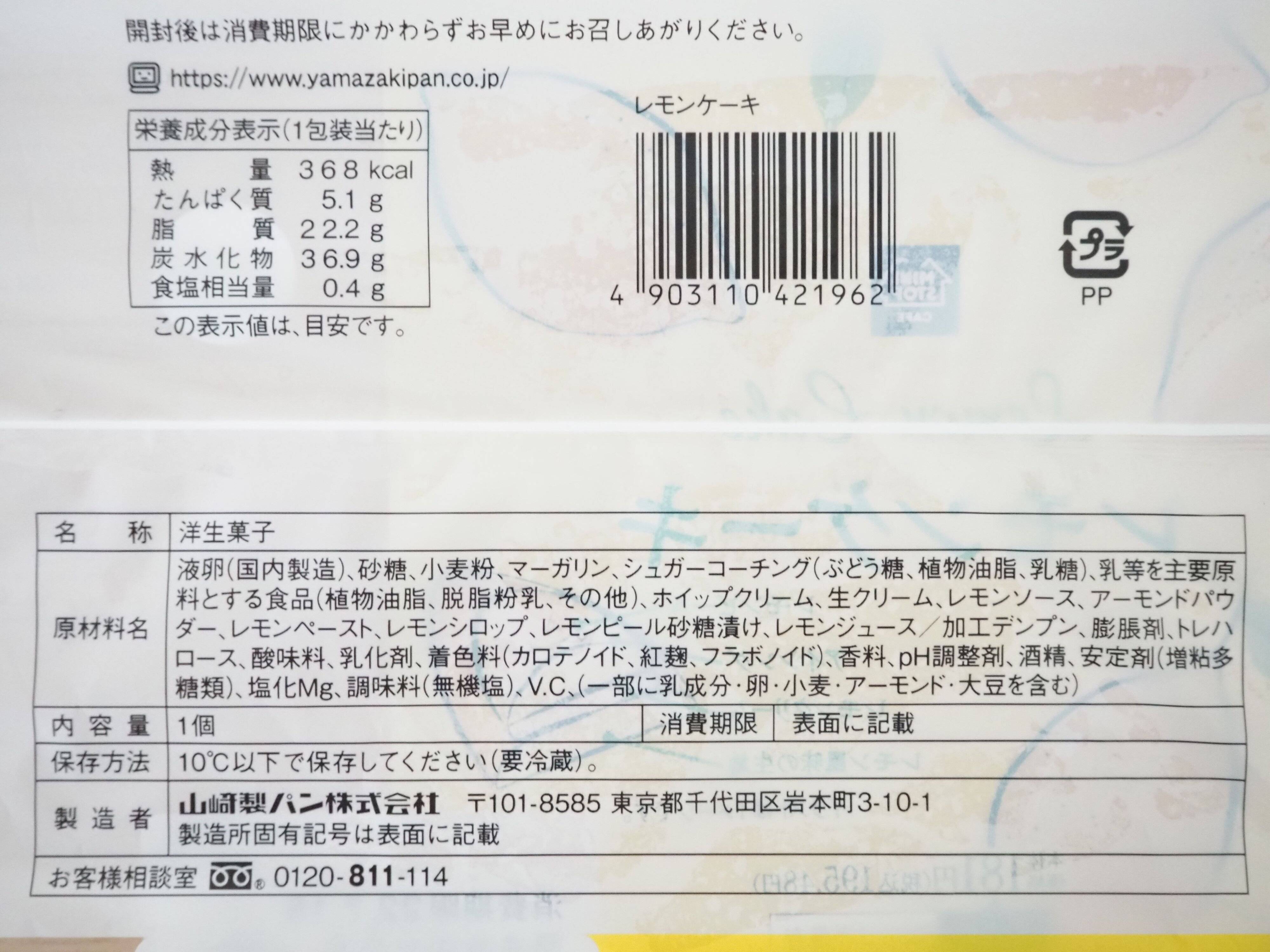 原材料表記を見ると、レモンソース、レモンペースト、レモンシロップ、レモンピール砂糖漬け、レモンジュースと、たくさんのレモン系素材が使用されていることがわかります。