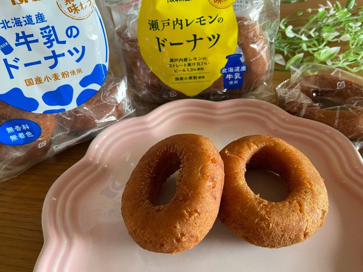 個包装のドーナツが8個。定番の牛乳ドーナツと並べてみました。見た目はほぼ同じですが、食べてみると全然違います。予想以上にレモンが濃い!