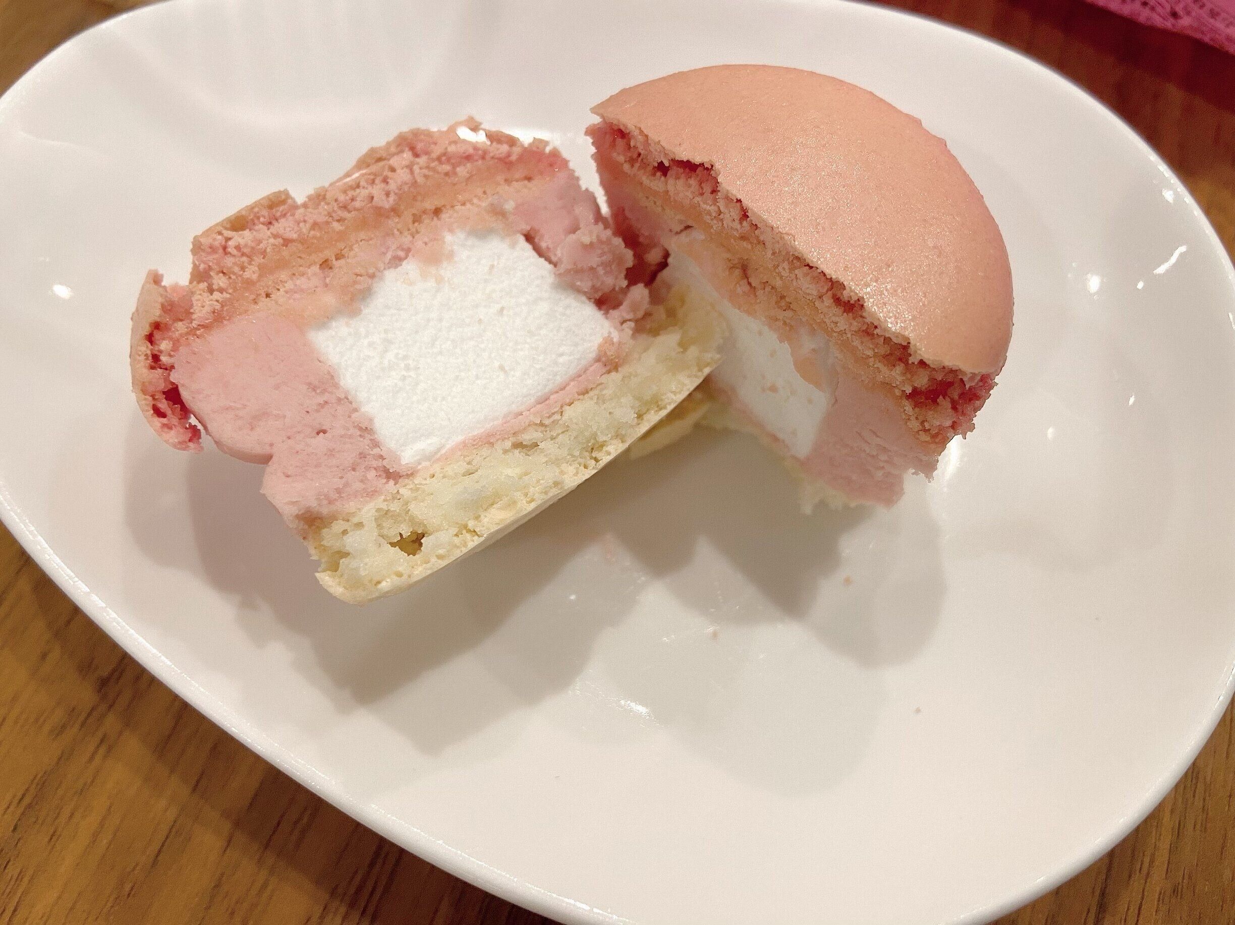マカロン生地には苺ガナッシュと白いマシュマロがサンドされています。