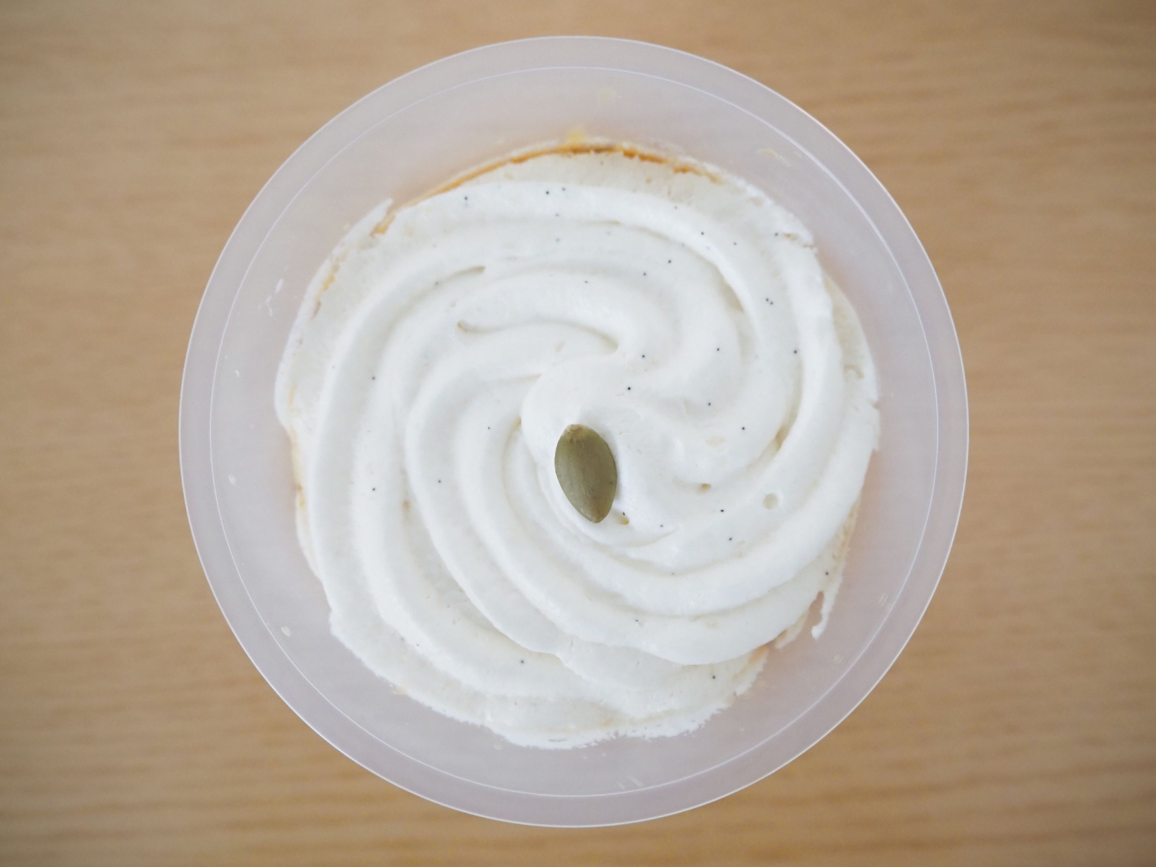 ふたを取ってみると、目に入るのは渦を巻いたチーズクリーム。添えられたパンプキンシードがおしゃれですね!
