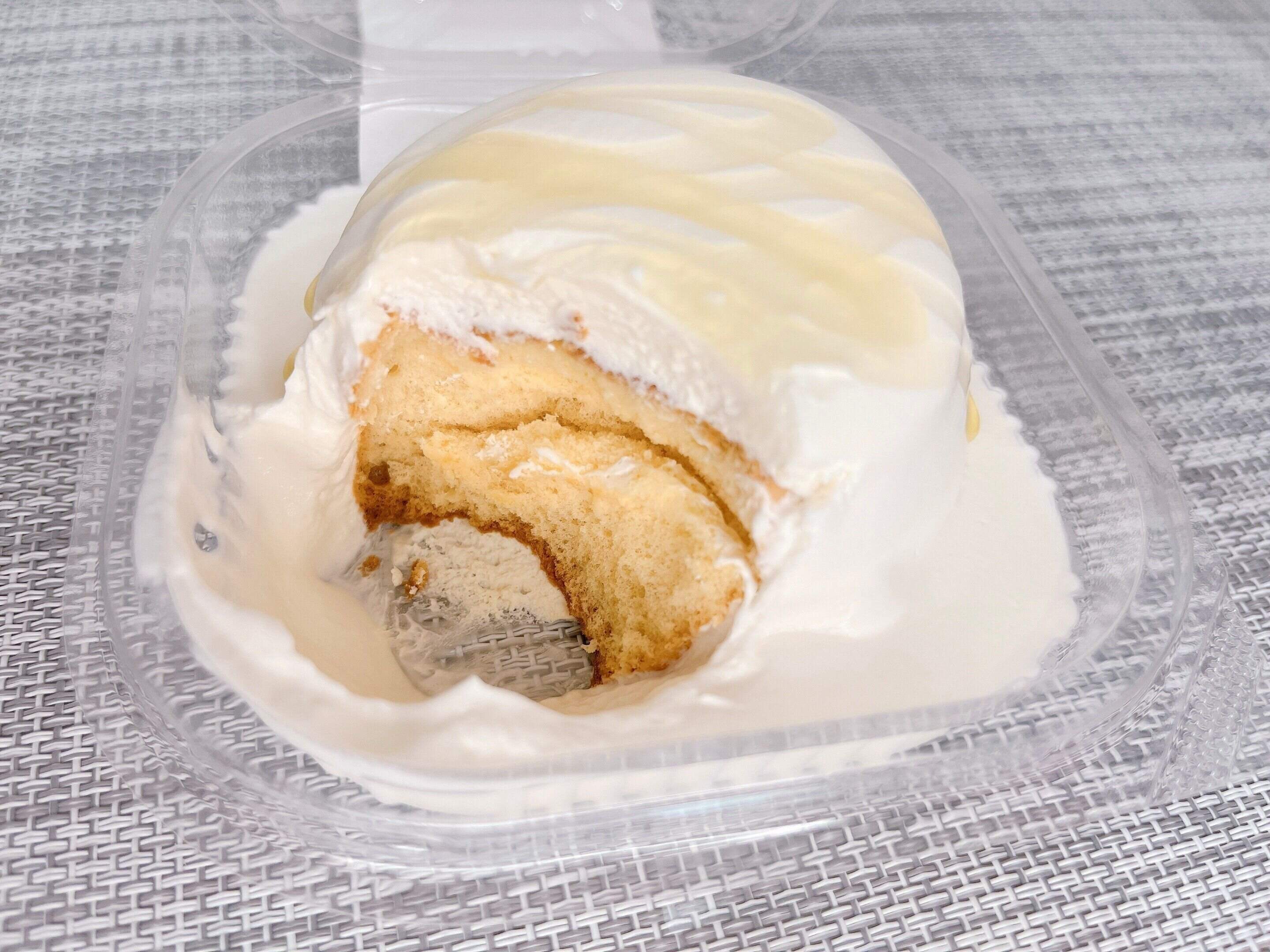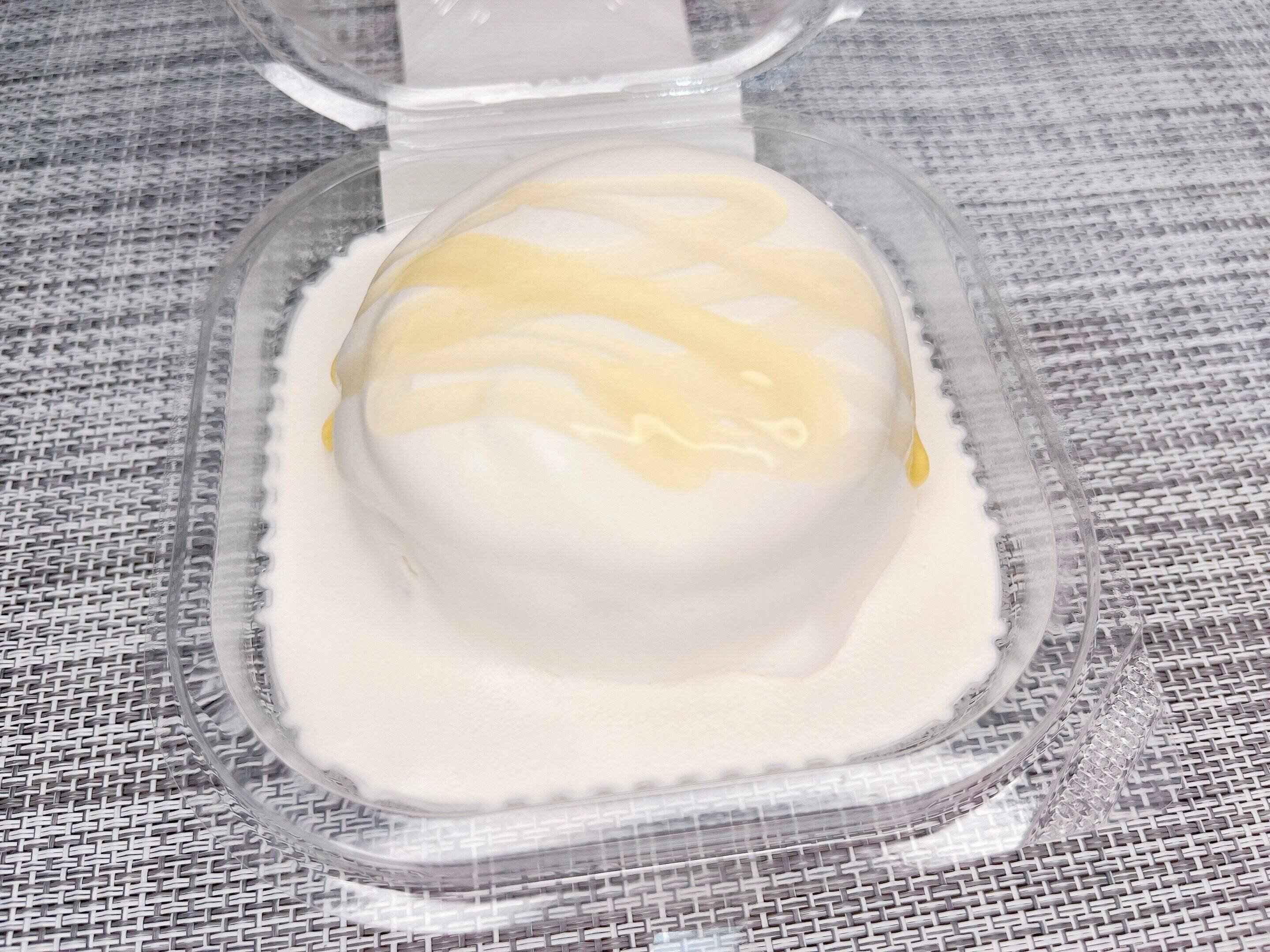 フタを開けるとたっぷり過ぎるクリームで全面的に覆われていてパンケーキの生地は見えません。はちみつソースがトッピングされていてとっても美味しそうです。