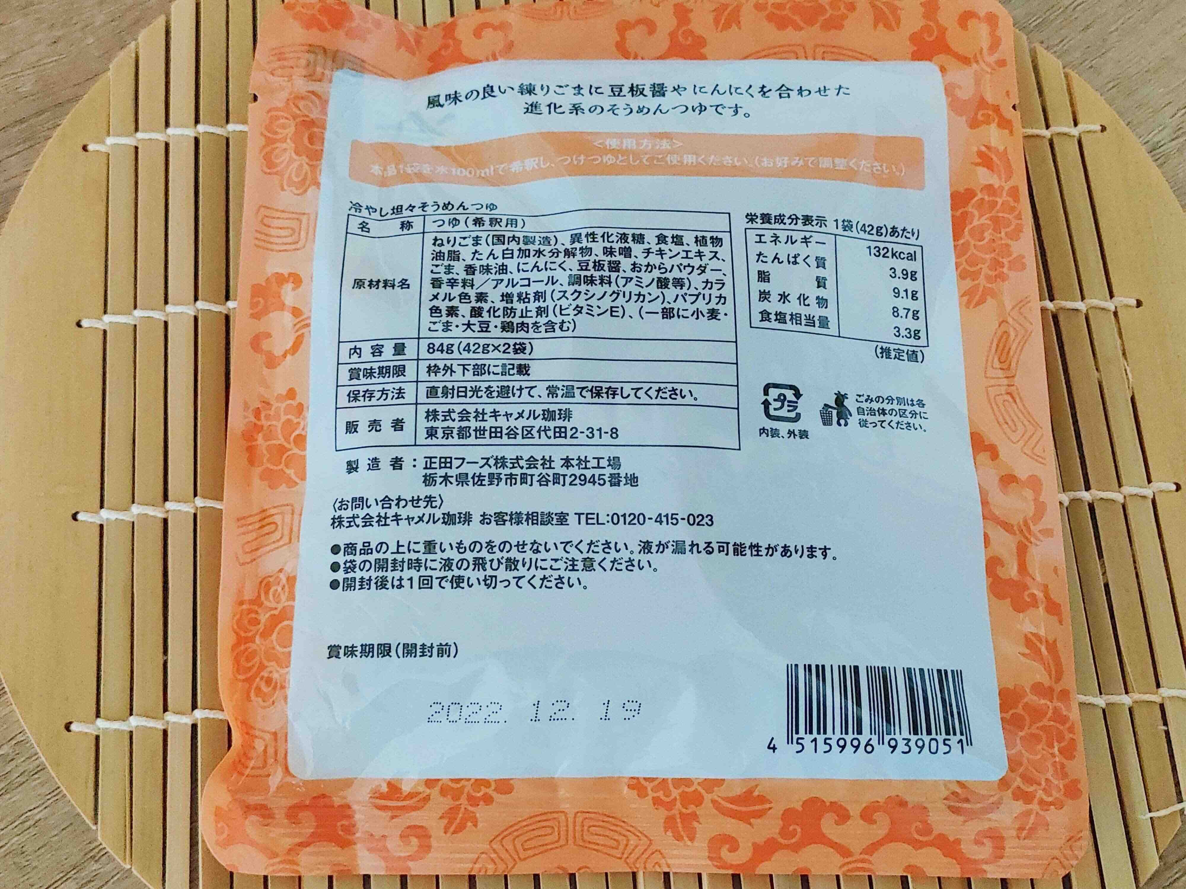 こちらが「冷やし坦々素麺つゆ」180円です。こちらも2袋入り。