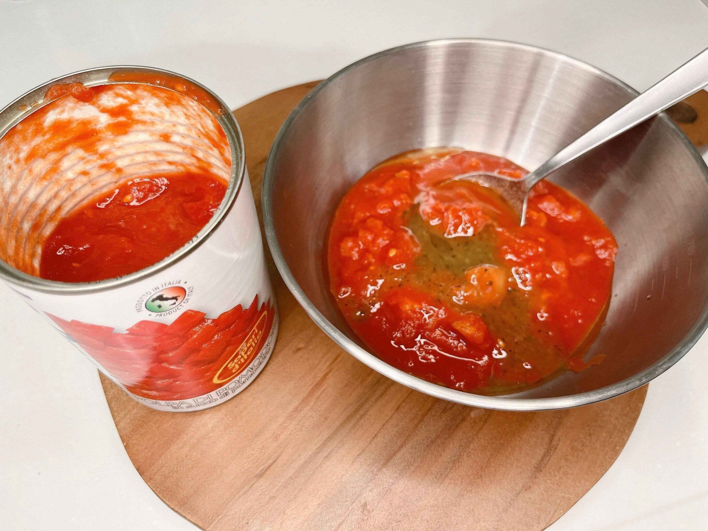 トマト缶半分と、本品1袋を混ぜ合わせ、あらかじめ冷蔵庫でよく冷やしておきます。トマト缶はダイスではなくホールしかない場合は、ハサミなどで細かく切った方が食べやすいです。細めのパスタ(カッペリーニ)を茹でて、冷水で冷やします。冷やしたパスタに、冷蔵庫で冷やしたトマト缶入りパスタソースをかけ、混ぜ合わせたら完成です。