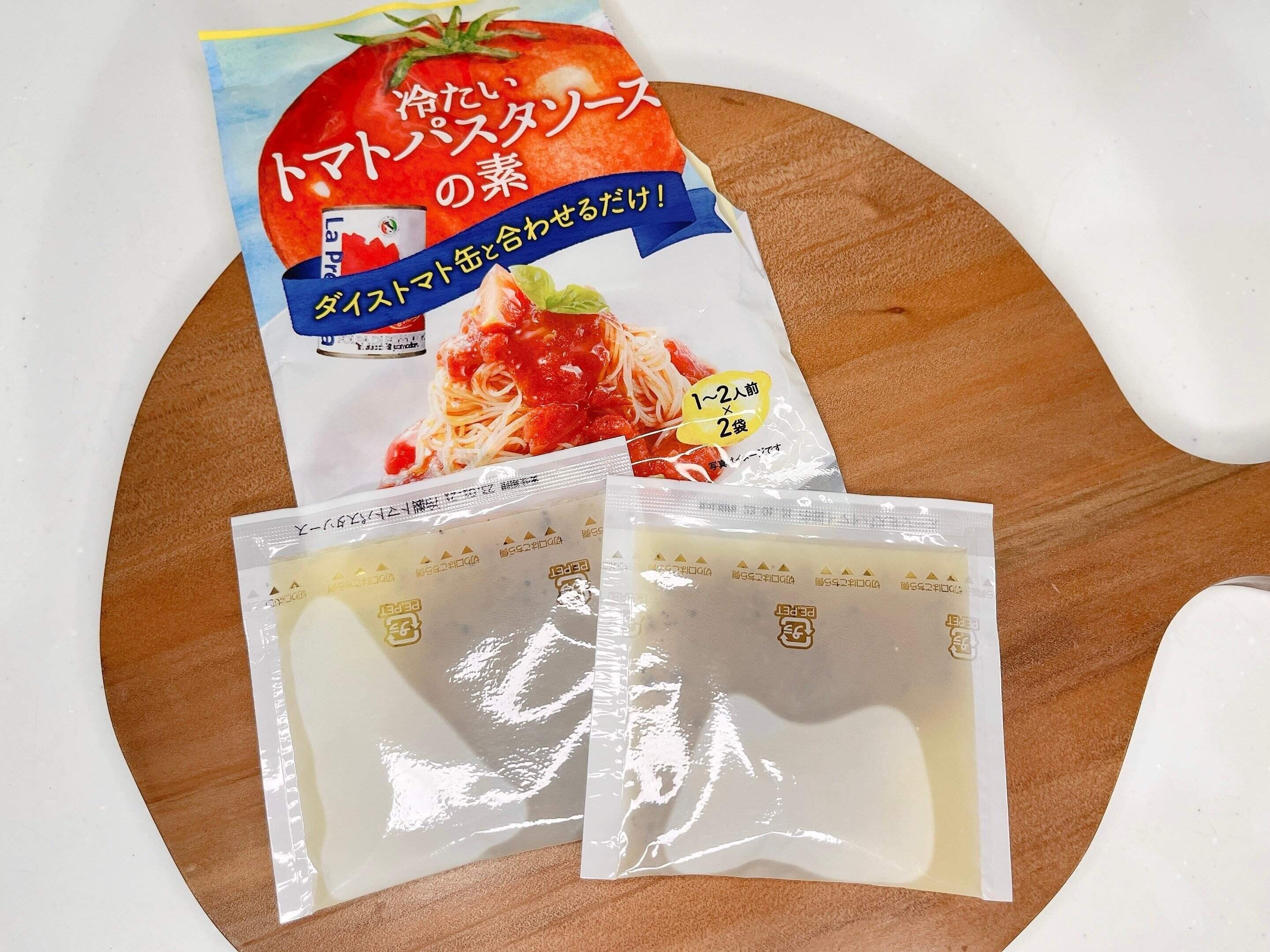 ダイストマト缶を用意するだけで、簡単に冷製トマトパスタソースが作れる「冷たいトマトパスタソースの素」は、にんにくやバジル、オレガノの風味がアクセントになった本格的な味わいの冷製パスタを作ることが出来ます。