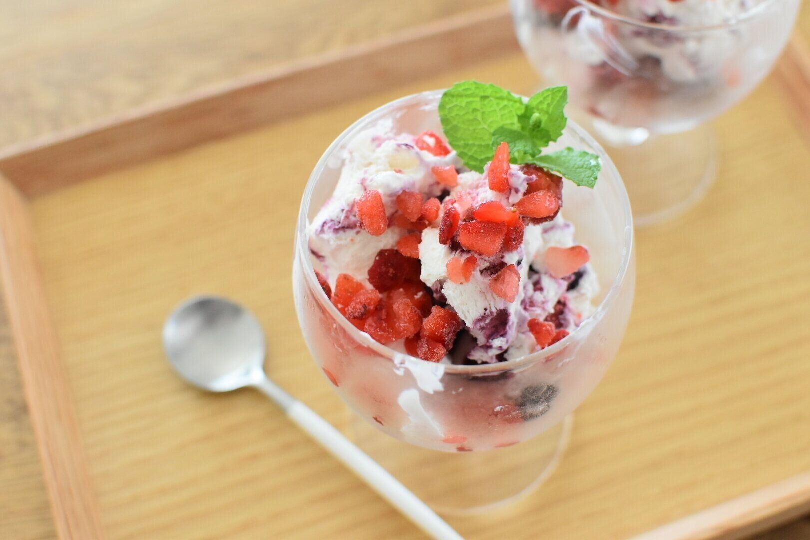 市販のバニラアイスに冷凍いちごを混ぜ合わせ、もう一度冷凍して固まったらできあがり!