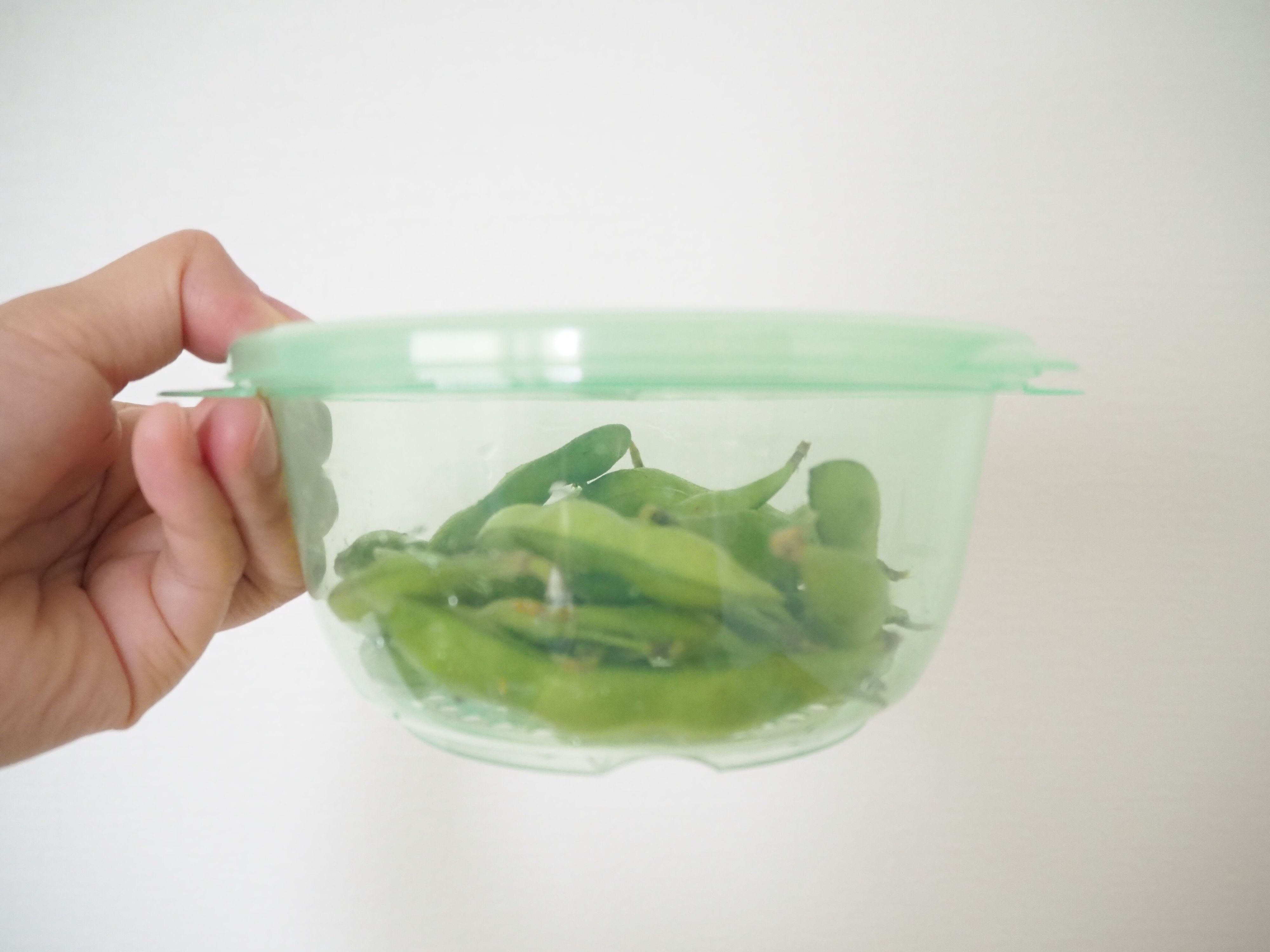 それをそのまま容器に重ね、あとは500wで2分30秒加熱するだけ。説明書きによると、えだ豆の水分で蒸すため、水を加える必要もないとのこと。