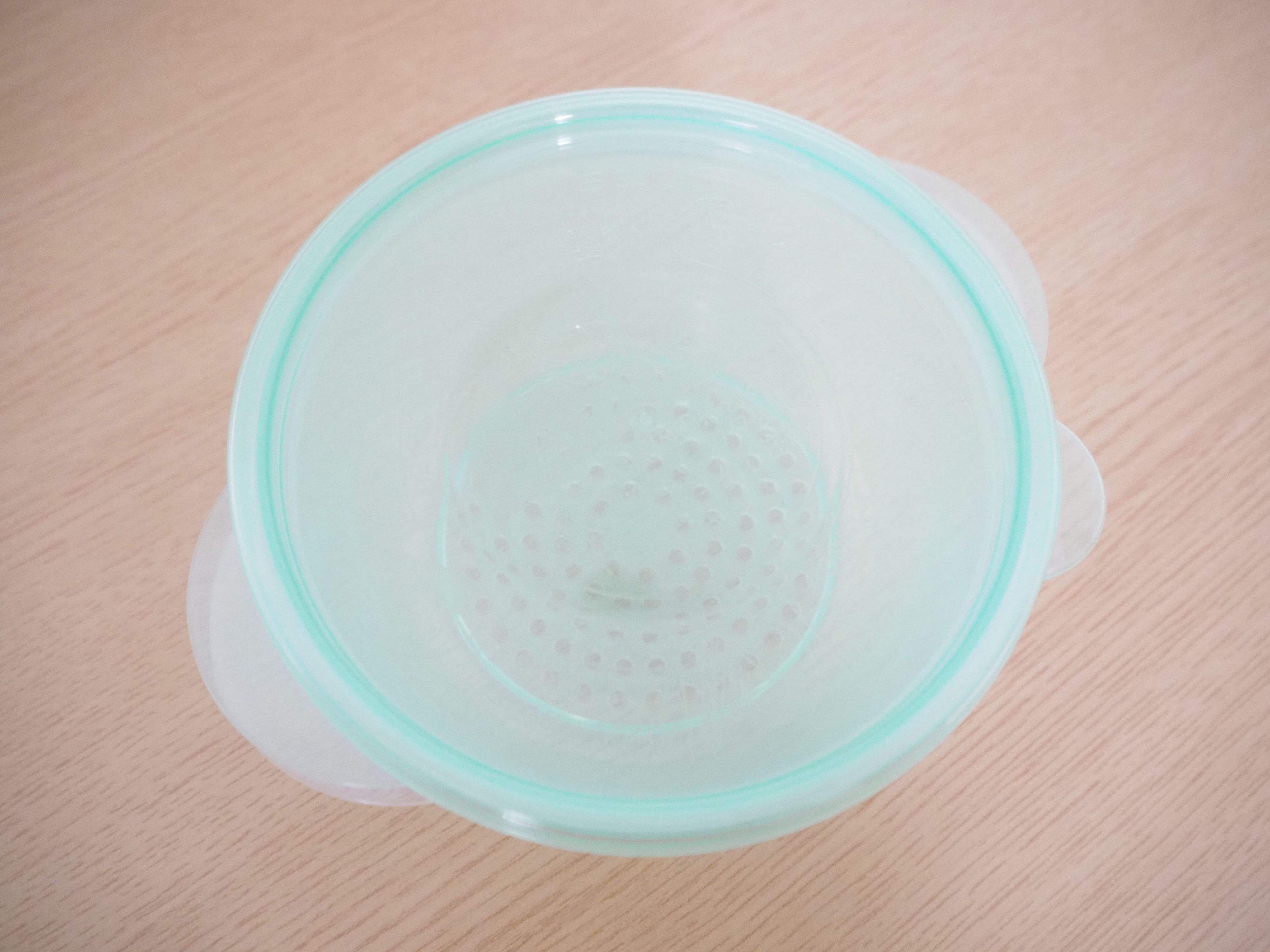 どれくらい簡単に調理ができるのか、実際に使ってみたいと思います。まずはえだ豆をザルに入れて洗い、フタをします。入れる量の目安は100gです。