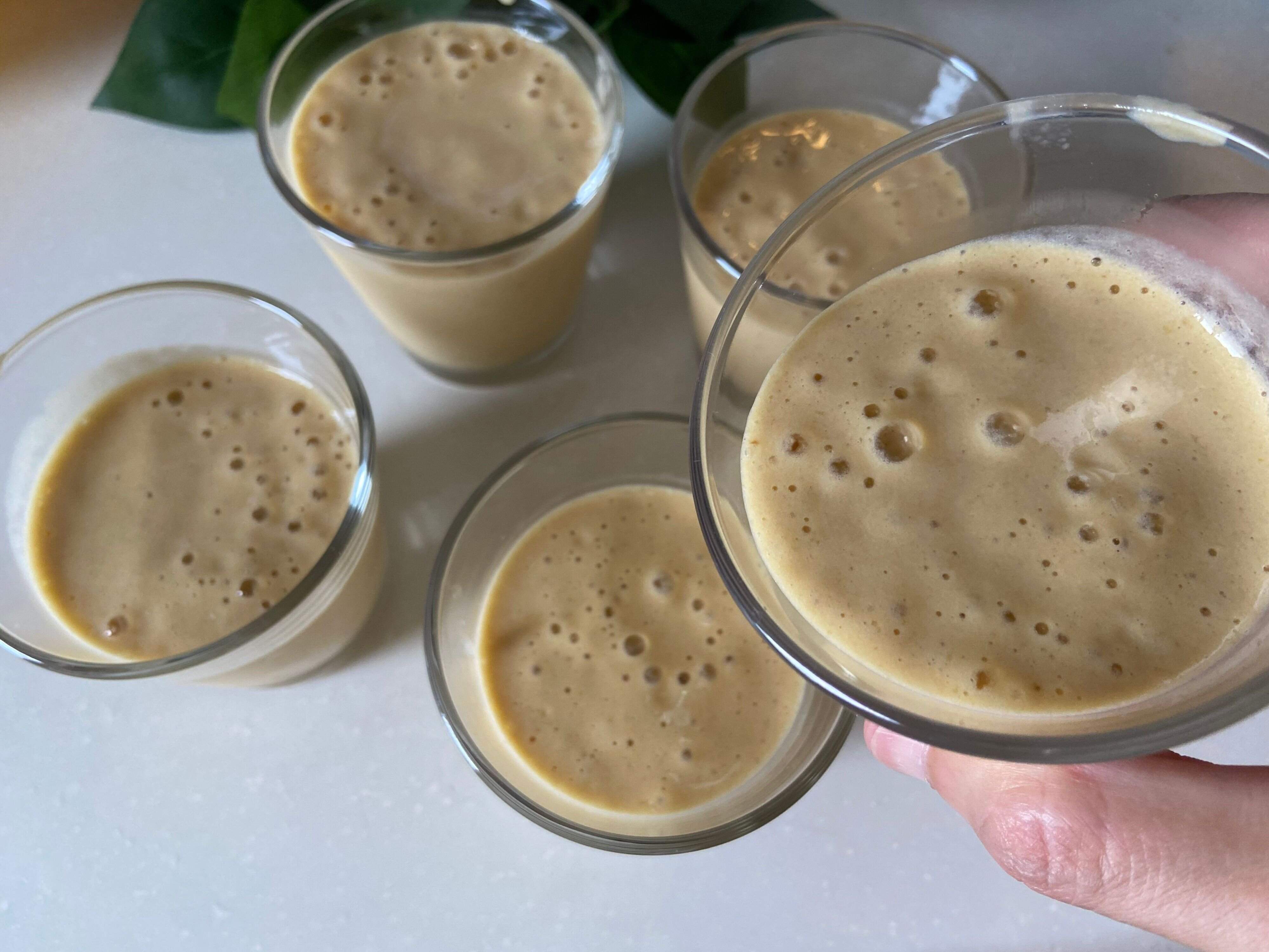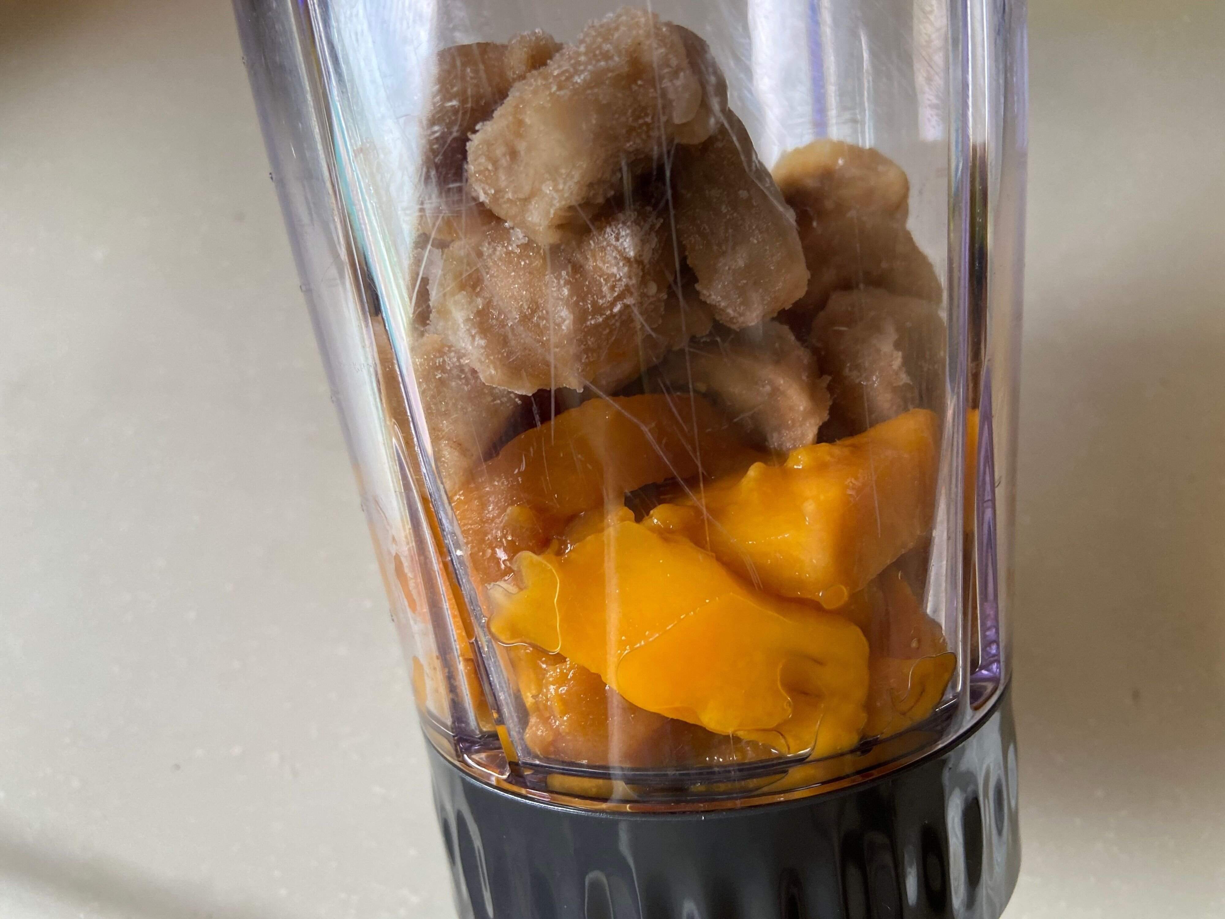 朝食時にフルーツスムージーを作りました。マンゴーとバナナと牛乳のみ、砂糖は不使用です。