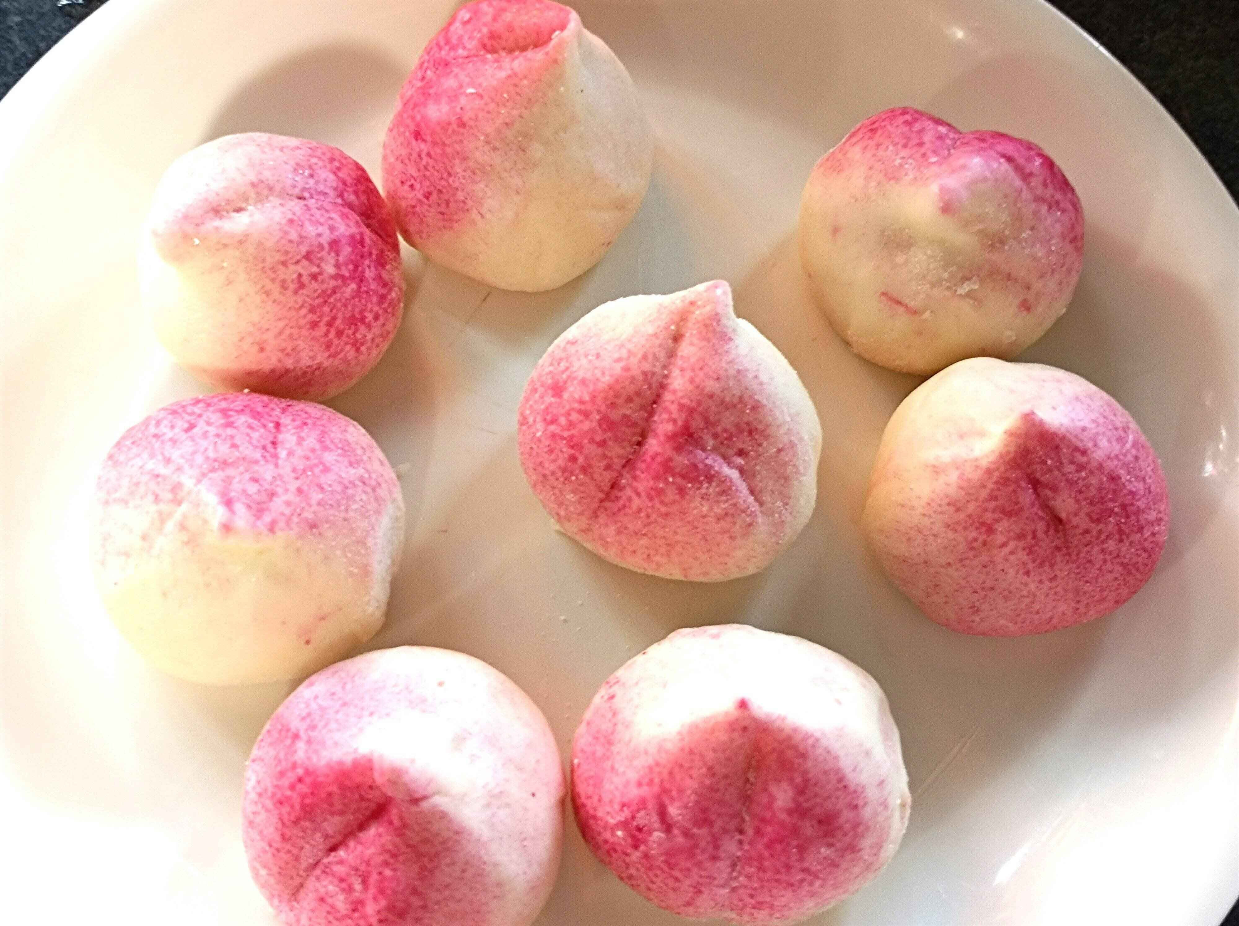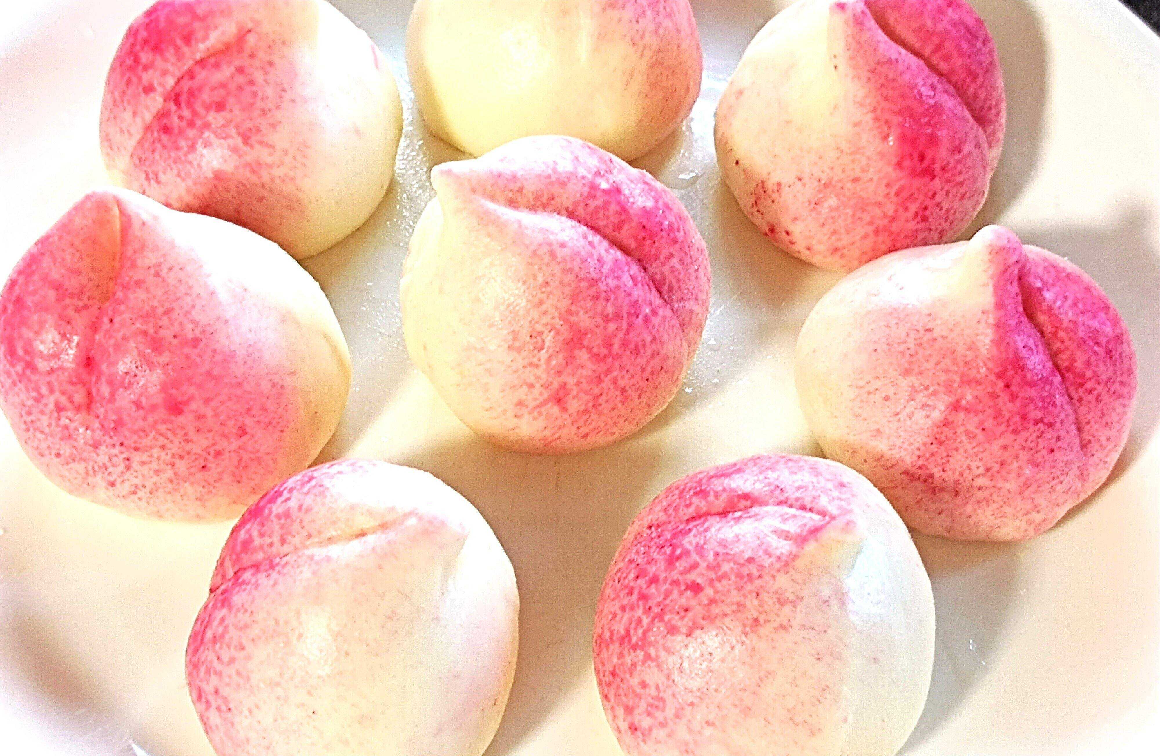冷凍庫から取り出した桃まんじゅうをさっと水にさらし、耐熱皿にのせます。ラップをして、3個当たり1分半を目安に500wで加熱したものが、こちらです。