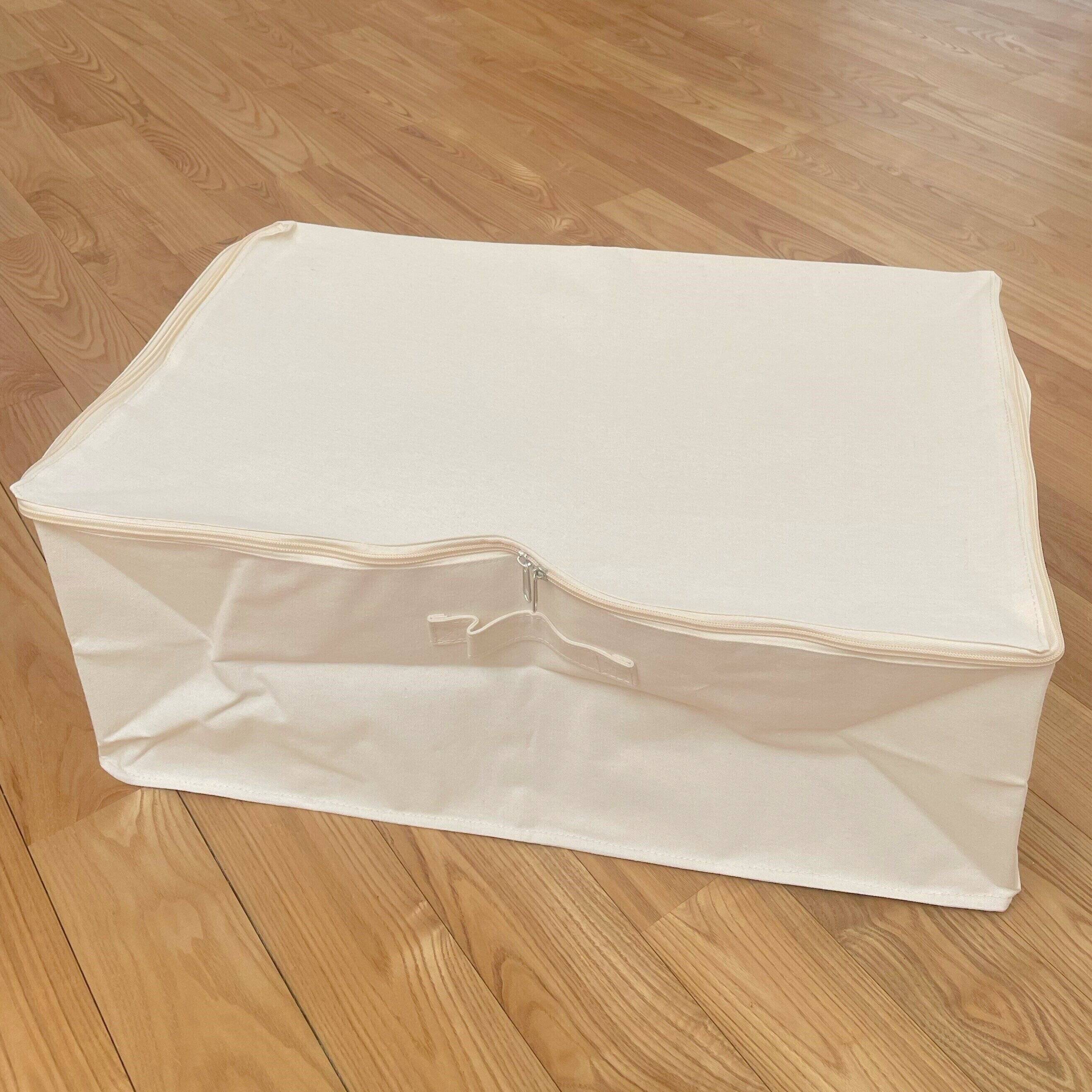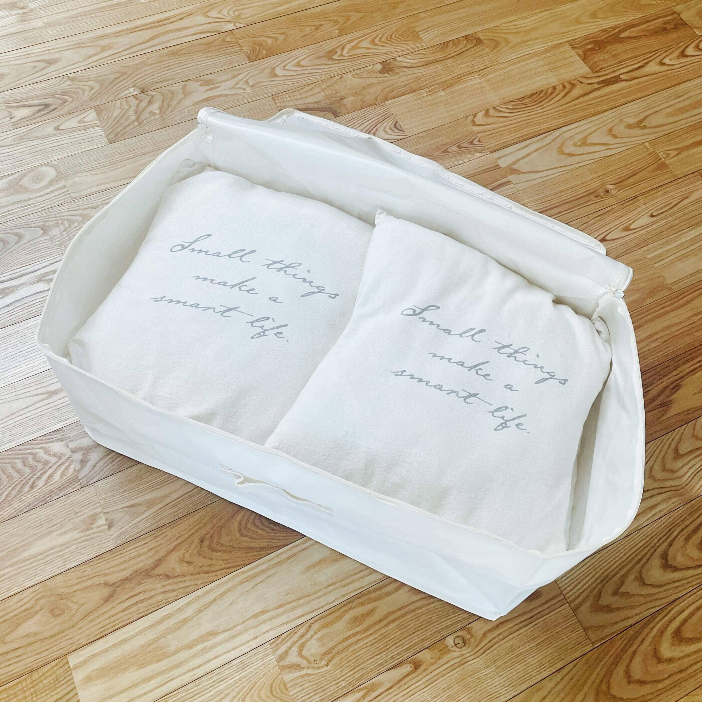 縦39×横59×高さ23cmの大容量サイズなので、使わない毛布やカーペットなどを畳んでしまえるサイズ。高さが合えば、ベッド下収納にも使えそうですね。