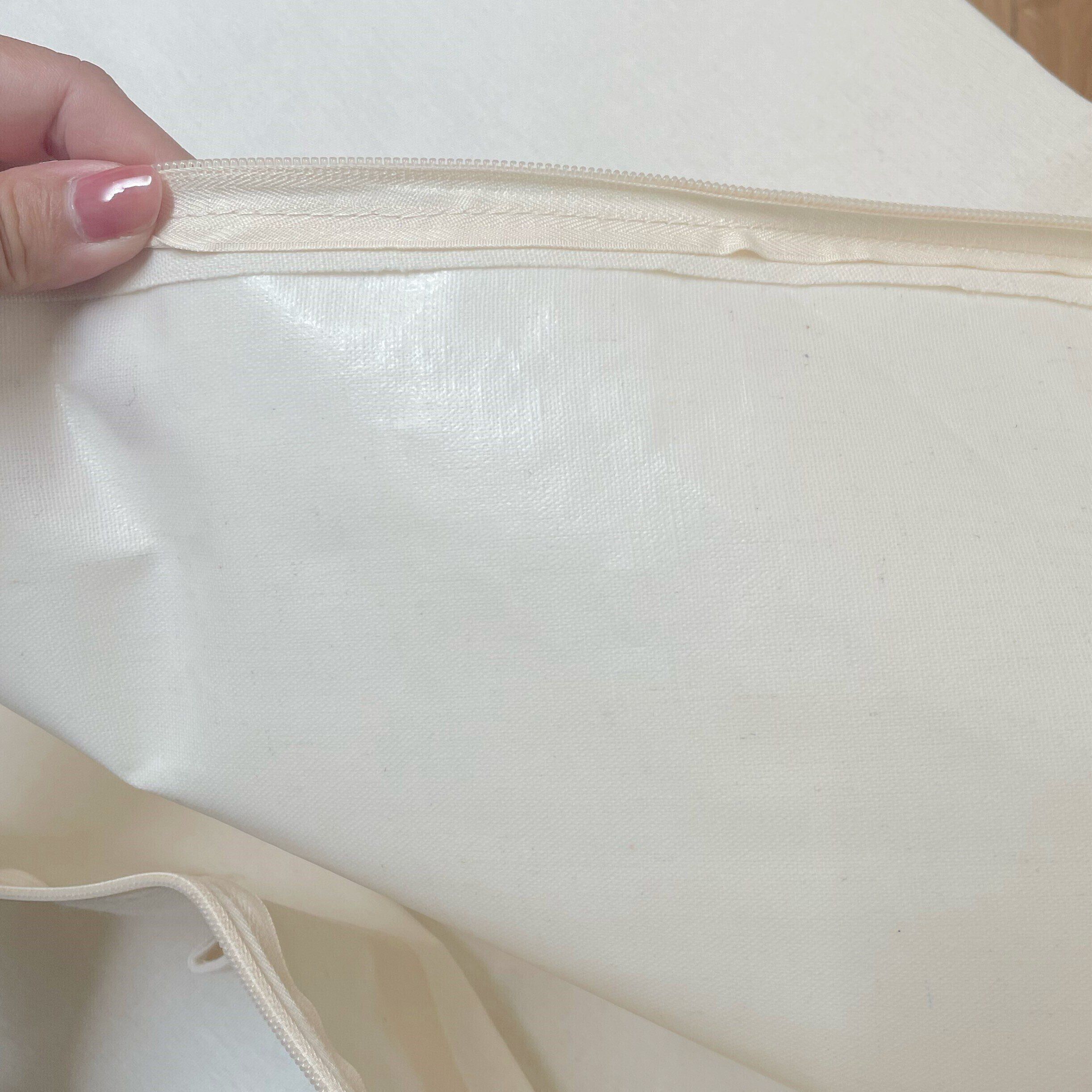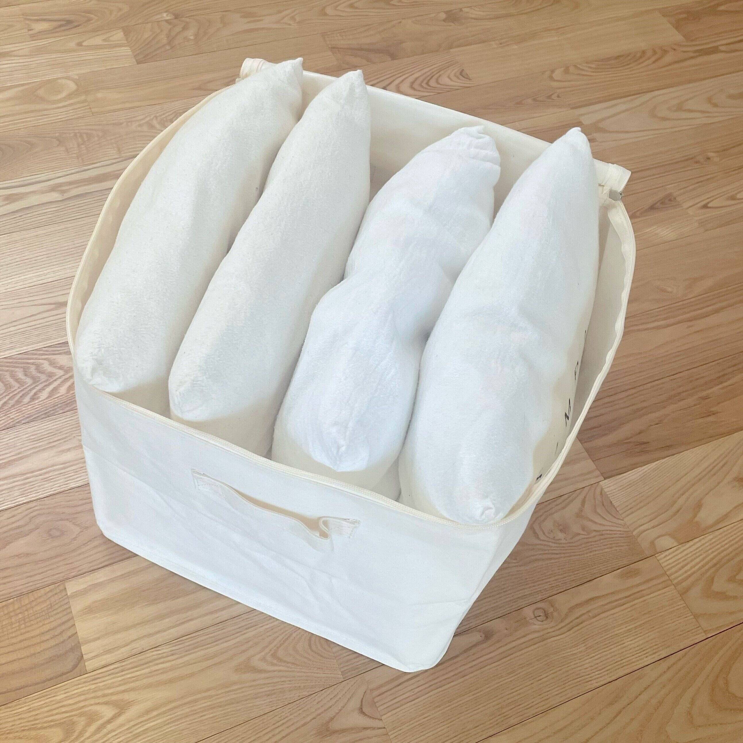 わが家のクッションが4つ入るほどの大きさです。見た目以上に大容量なので、衣類などは圧縮すればかなり入ると思います。