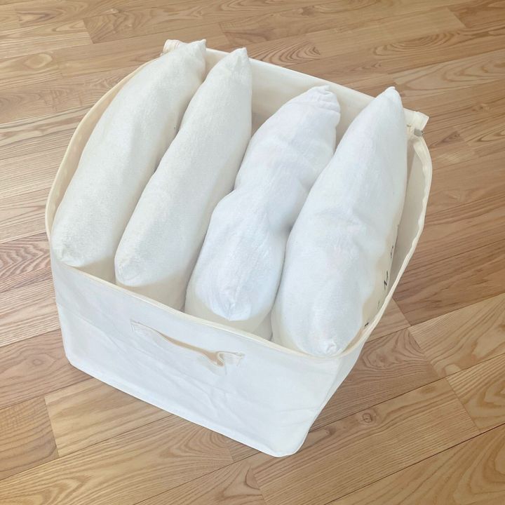 わが家のクッション4つを入れて見ましたが、まだ高さに余裕があるので6個入りそうです。こちらもふたつきなので、ホコリやゴミから衣類を守ってくれますよ。